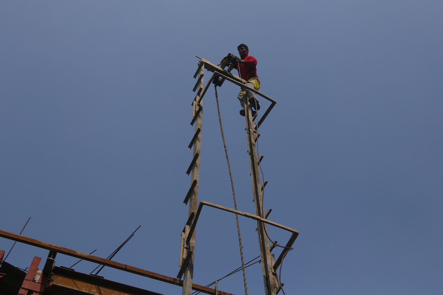 A worker sets up a pulley to elevate cement mixture for the construction of a house in Gongabu, Kathmandu. Kabin Adhikari/TKP