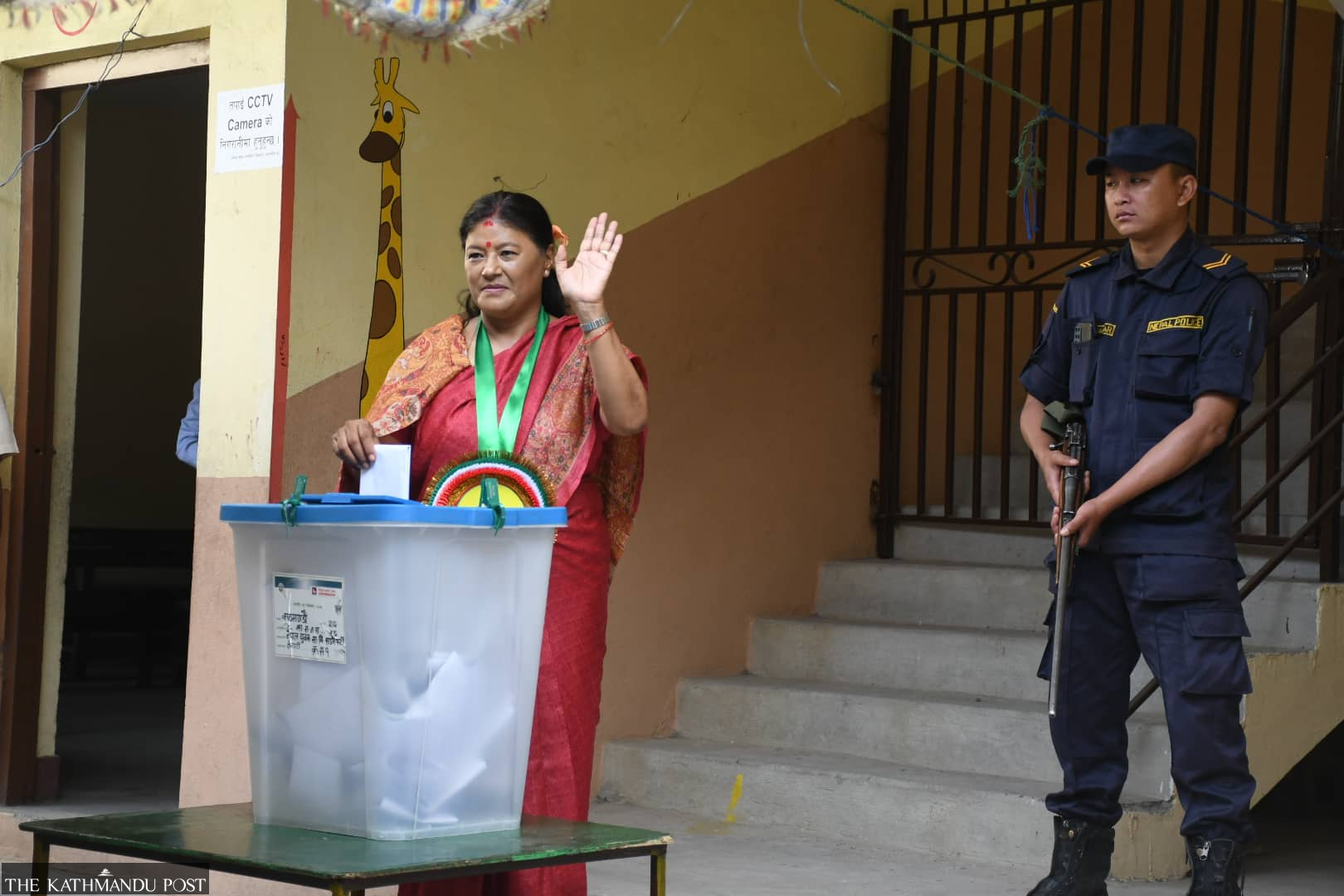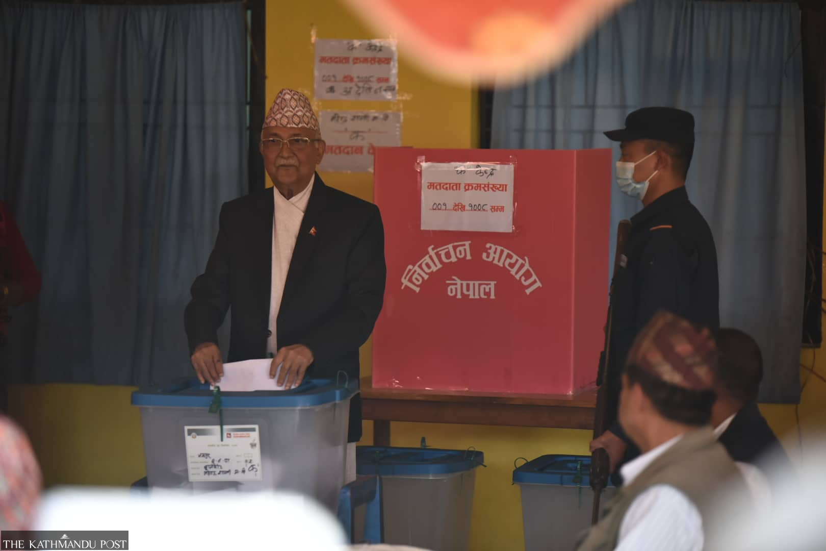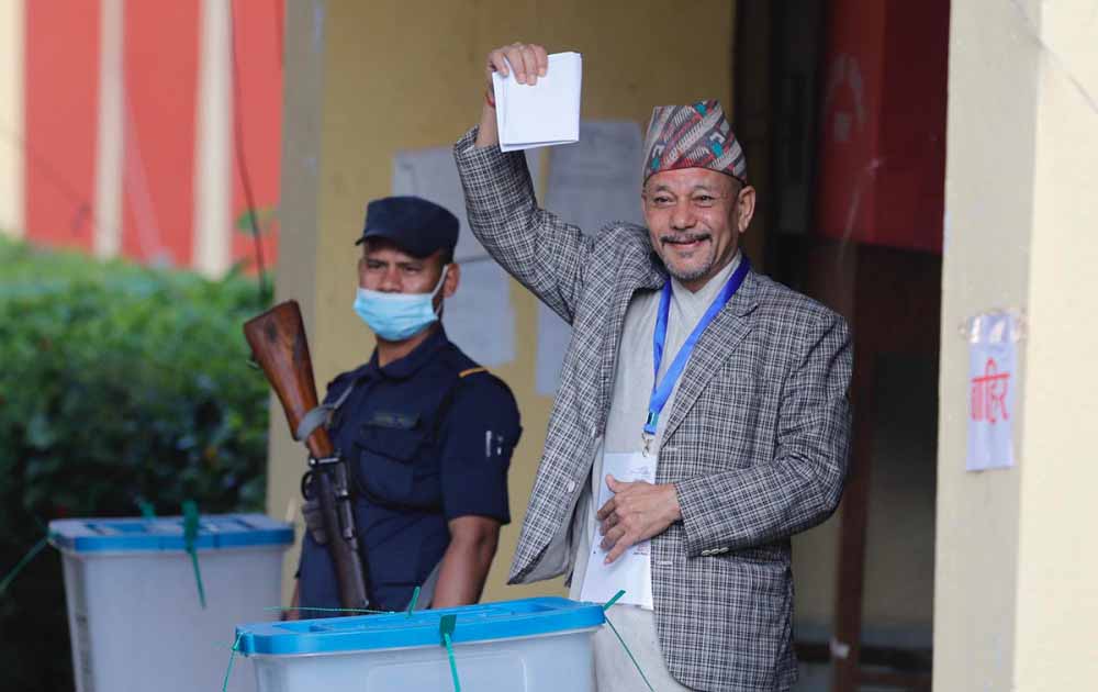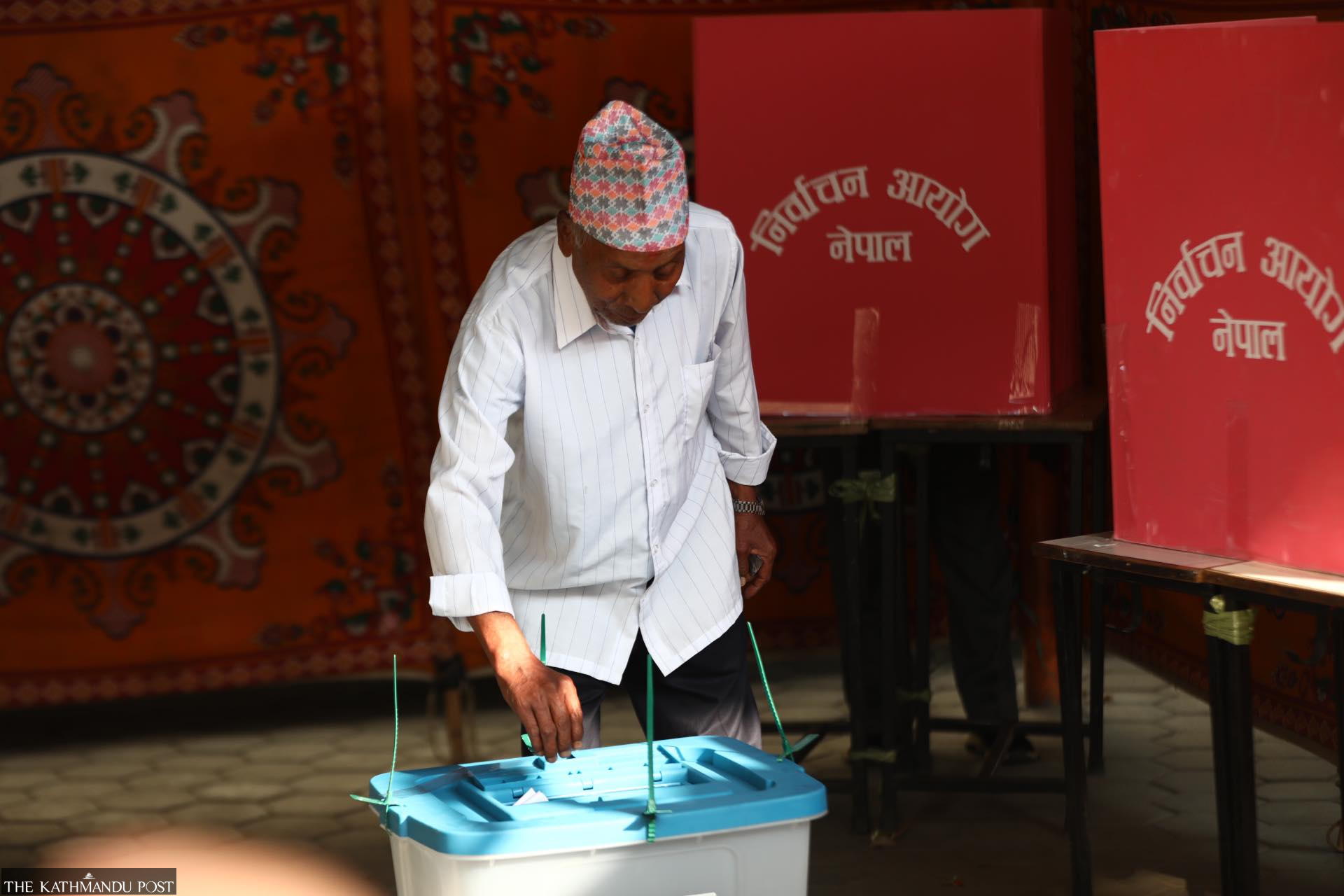 Kathmandu Metropolitan City mayoral candidate from CPN-UML, Keshav Sthapit casts his vote during the local level elections on Friday. Post Photo