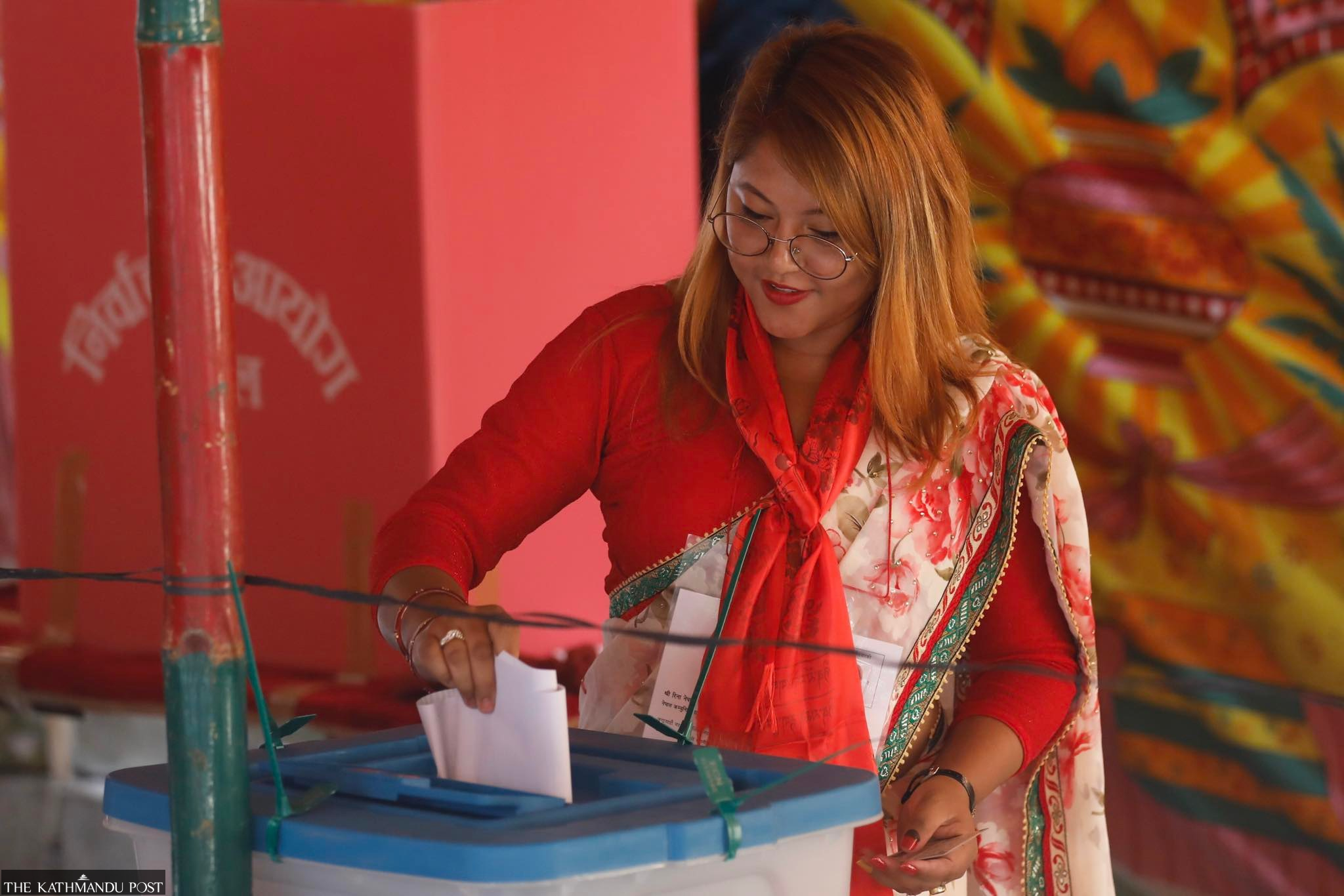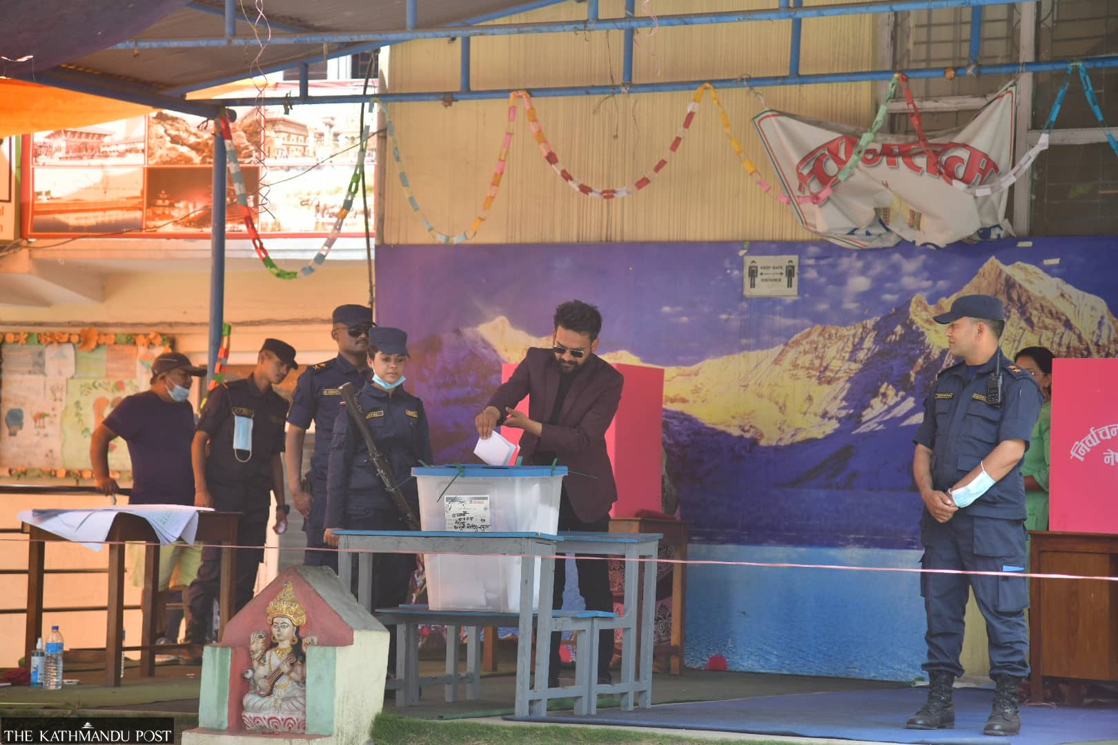Bhaktapur mayoral candidate Sunil Prajapati casts his vote on Friday. Prajapati is being feilded for the post by Nepal Majdoor Kisan Party. Post Photo