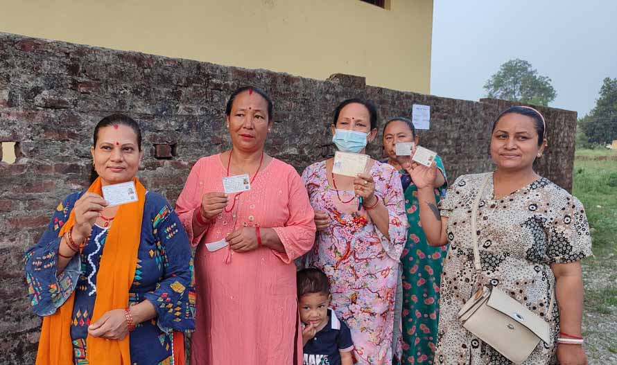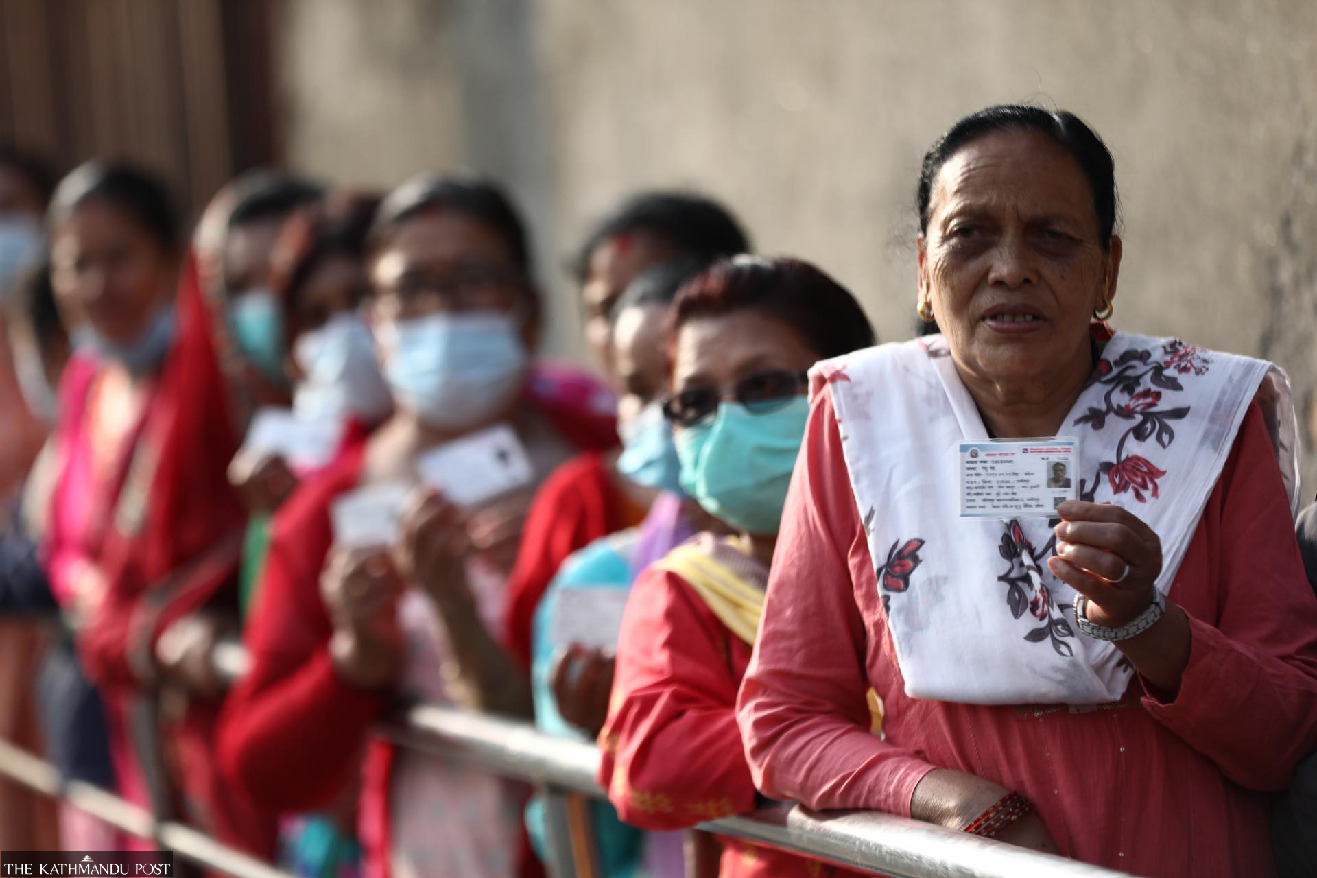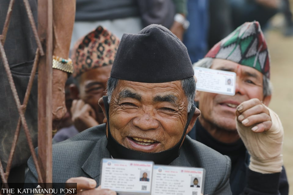 A group of voters display their voter id cards as they wait to cast their votes in Bharatpur, Chitwan on Friday. Post Photo