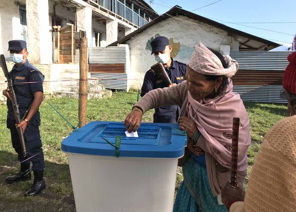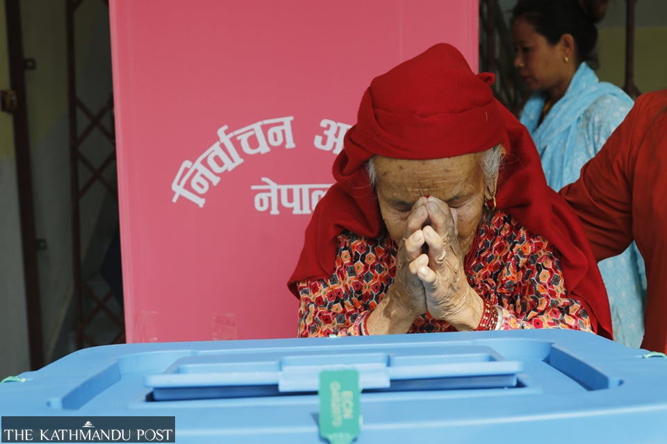 An elderly woman casts her vote during the local level election in Annapurna Rural Municipality of Myagdi on Friday. Ghanashyam Khadka/TKP