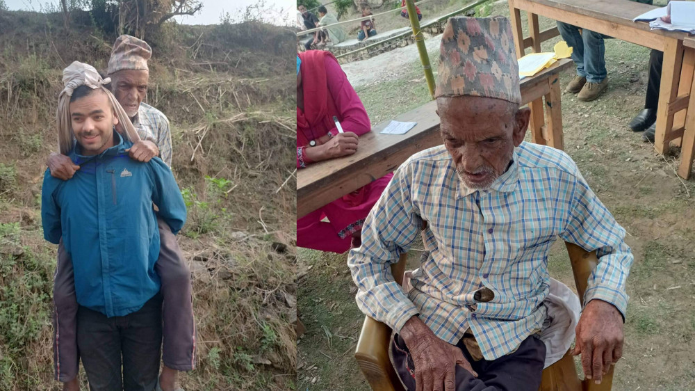 101-year-old Dhani Jaisi arrives to cast his vote in the local level election at Turmakhand Rural Municipality in Achham on Friday. Dhami was carried in a bamboo basket from his home to the polling station. Post Photo