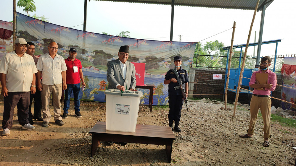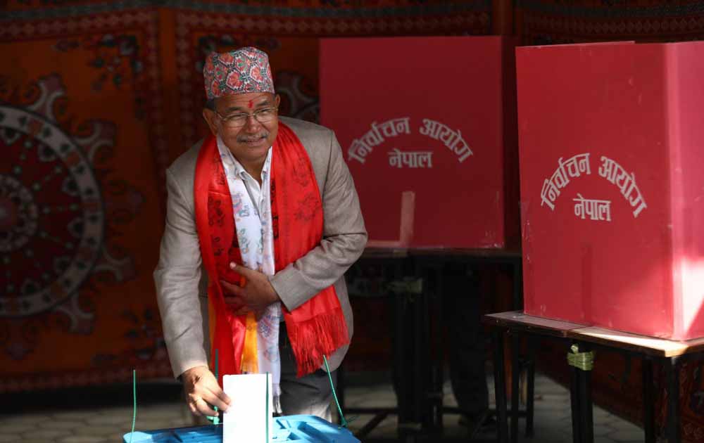 CPN (Maoist Centre) Pushpa Kamal Dahal casts his vote from Bharatpur in Chitwan during the local level election on Friday.