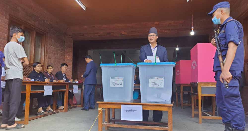 House of Representatives Speaker Agni Sapkota casts his vote from Chautara Sangachokgadi Municipality during the local level election on Friday.
