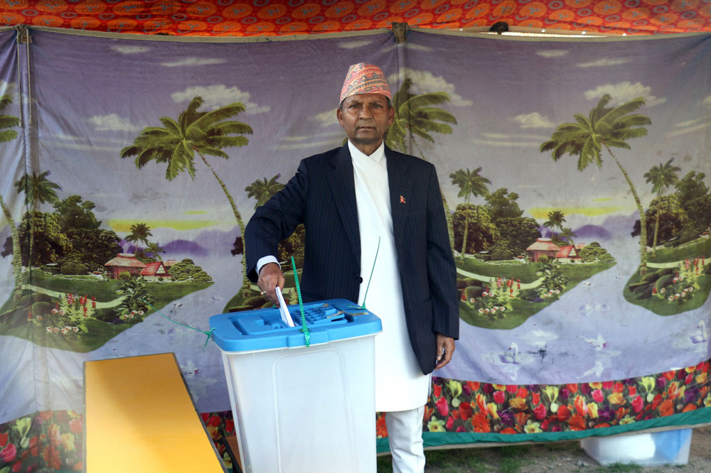 Former chairman of the Council of Ministers Khilraj Regmi casts his vote during the local level elections on Friday. RSS