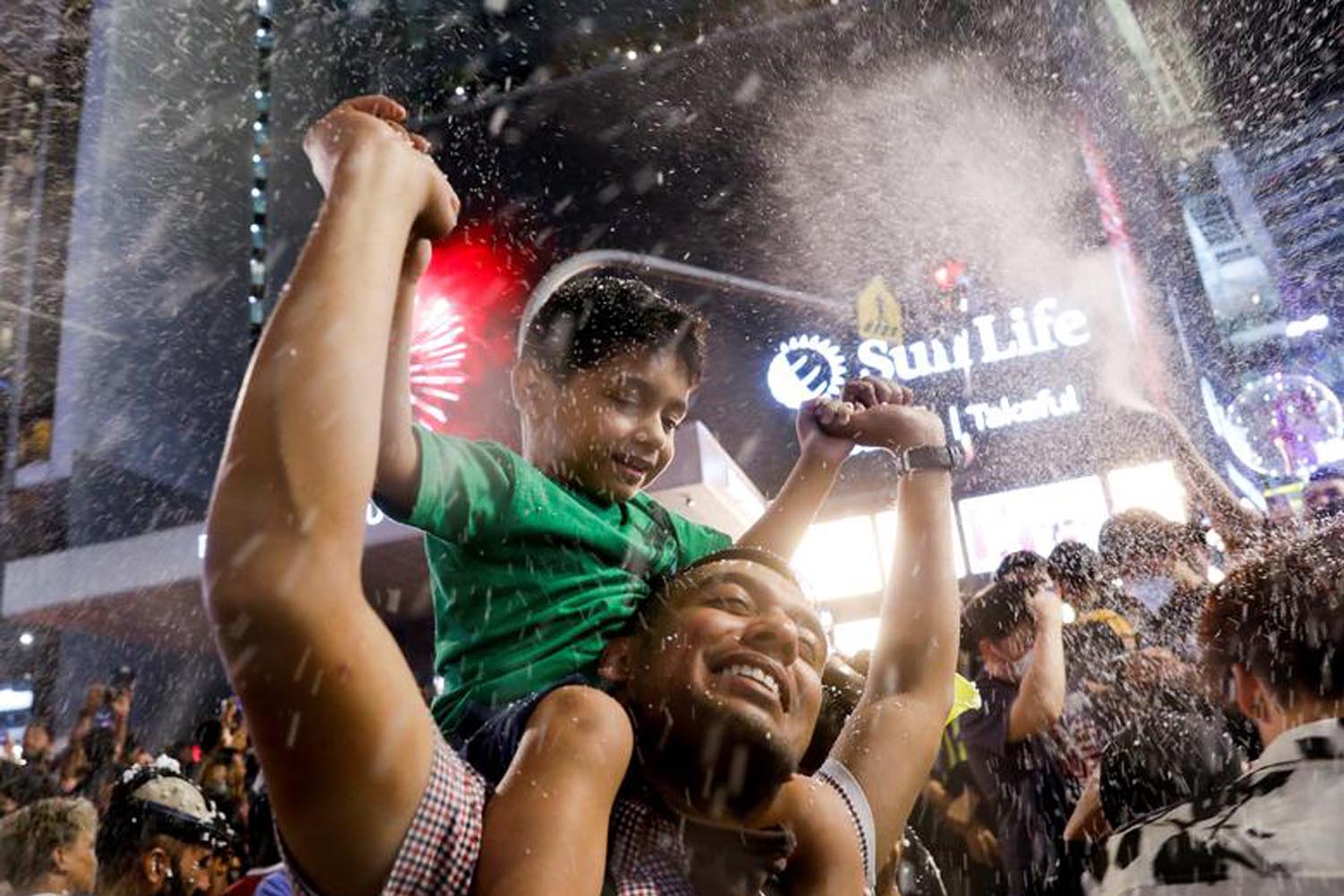 A man celebrates New Year's Eve with a kid in Kuala Lumpur, Malaysia. Reuters