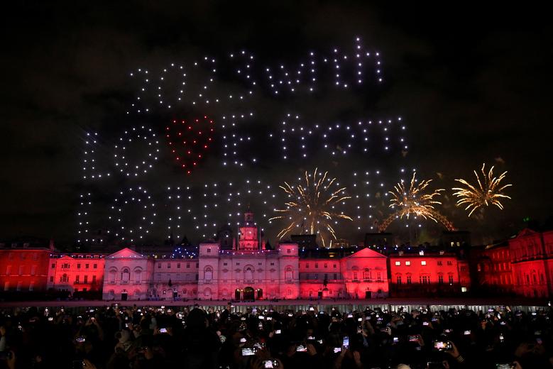 View of fireworks and a drone lighting display to mark the New Year, in London, Britain. Reuters