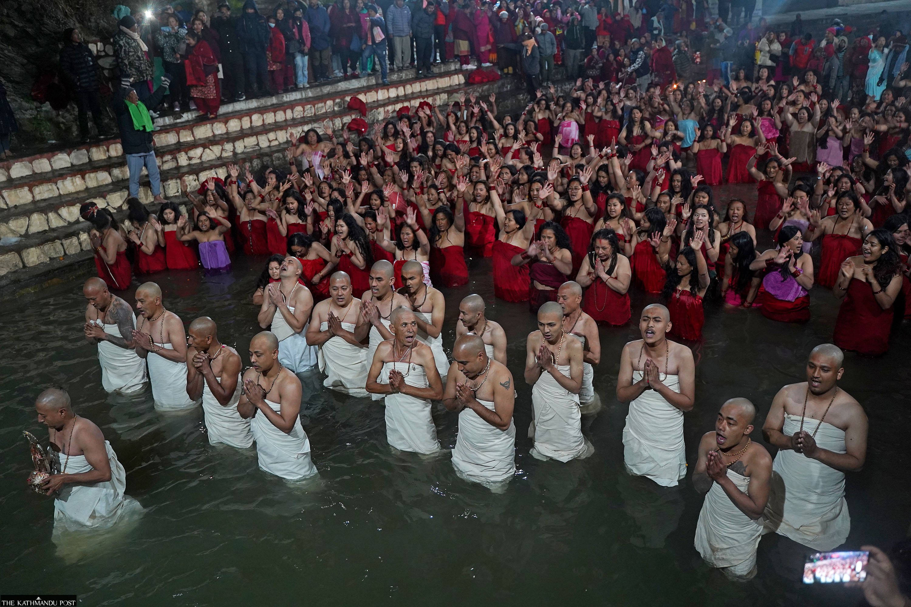 Devotees offer prayers at Salinadi in Sankhu as the month-long Madhav Narayan festival, also known for Swasthani recital, begins on Friday. Angad Dhakal/TKP