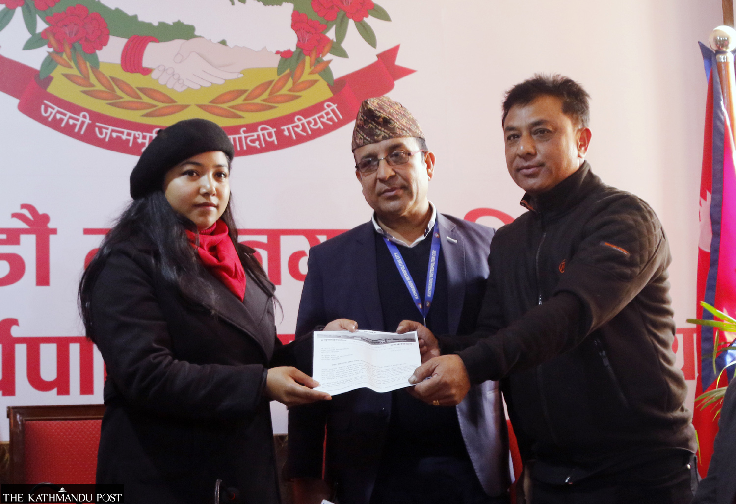 Members of the Occupy Tundikhel movement present a petition to Kathmandu Deputy Mayor Sunita Dangol (left) protesting the metropolis’ plan to construct a three-storey underground parking lot at Tundikhel on Monday. Keshav Thapa/TKP