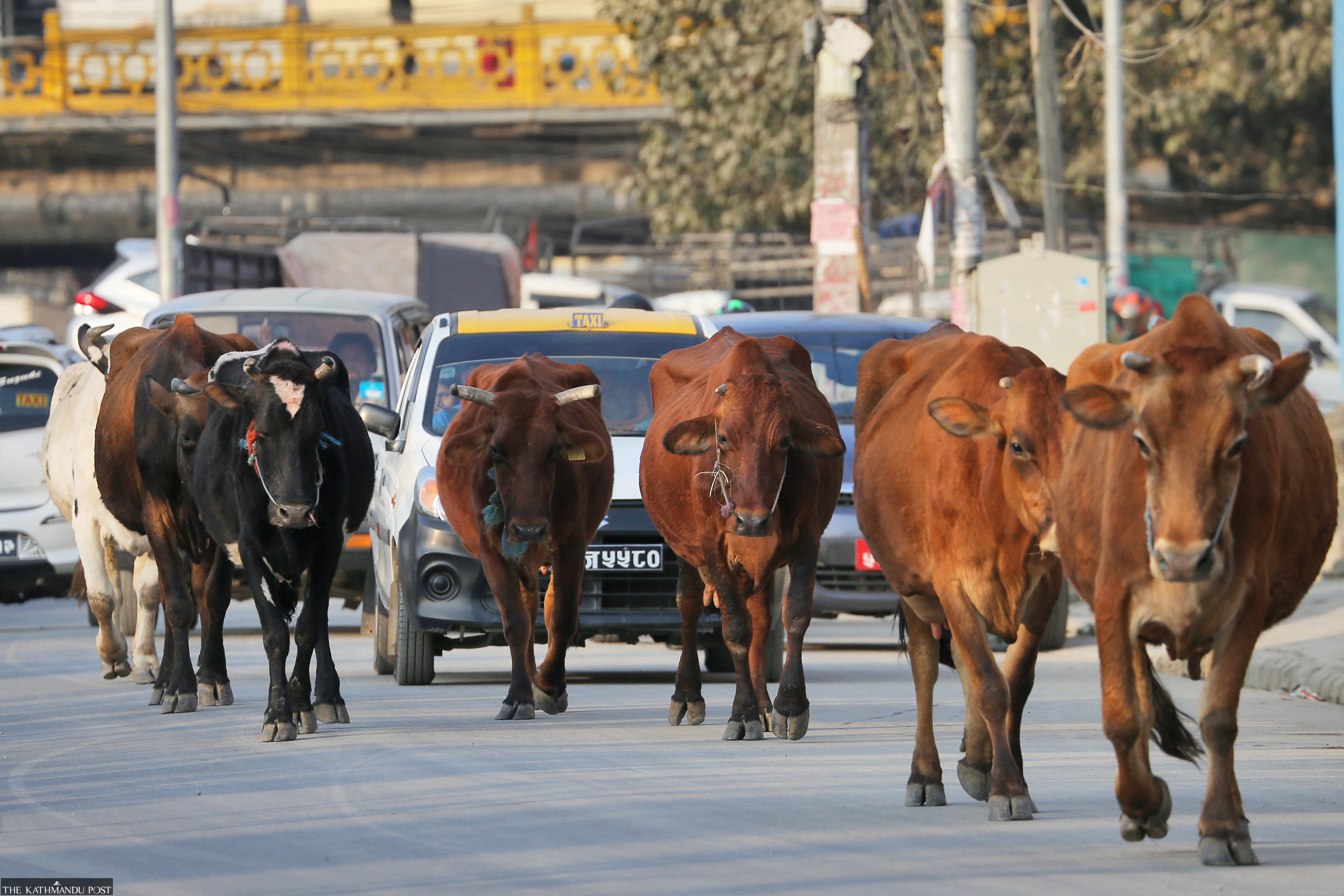 A herd of cows strolls along taking over a busy road at Subidhanagar, Tinkune in Kathmandu on Wednesday. Sanjog Manandhar/TKP