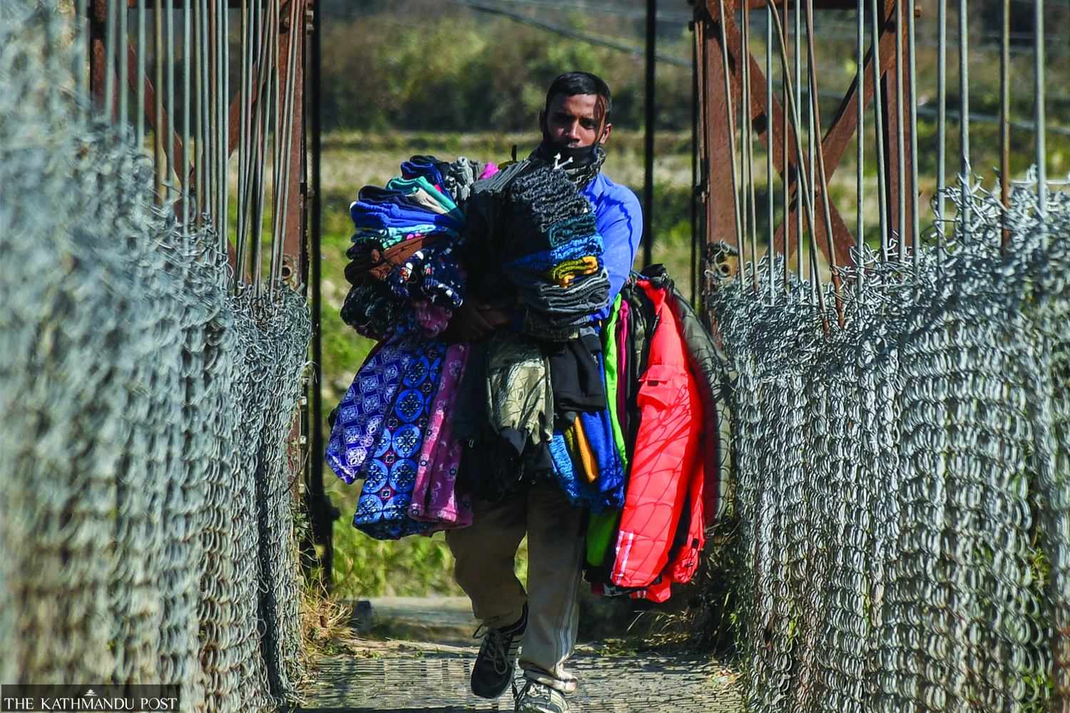 A clothes vendor walks through a suspension bridge at Khokana, Lalitpur on Wednesday. Anish Regmi/TKP