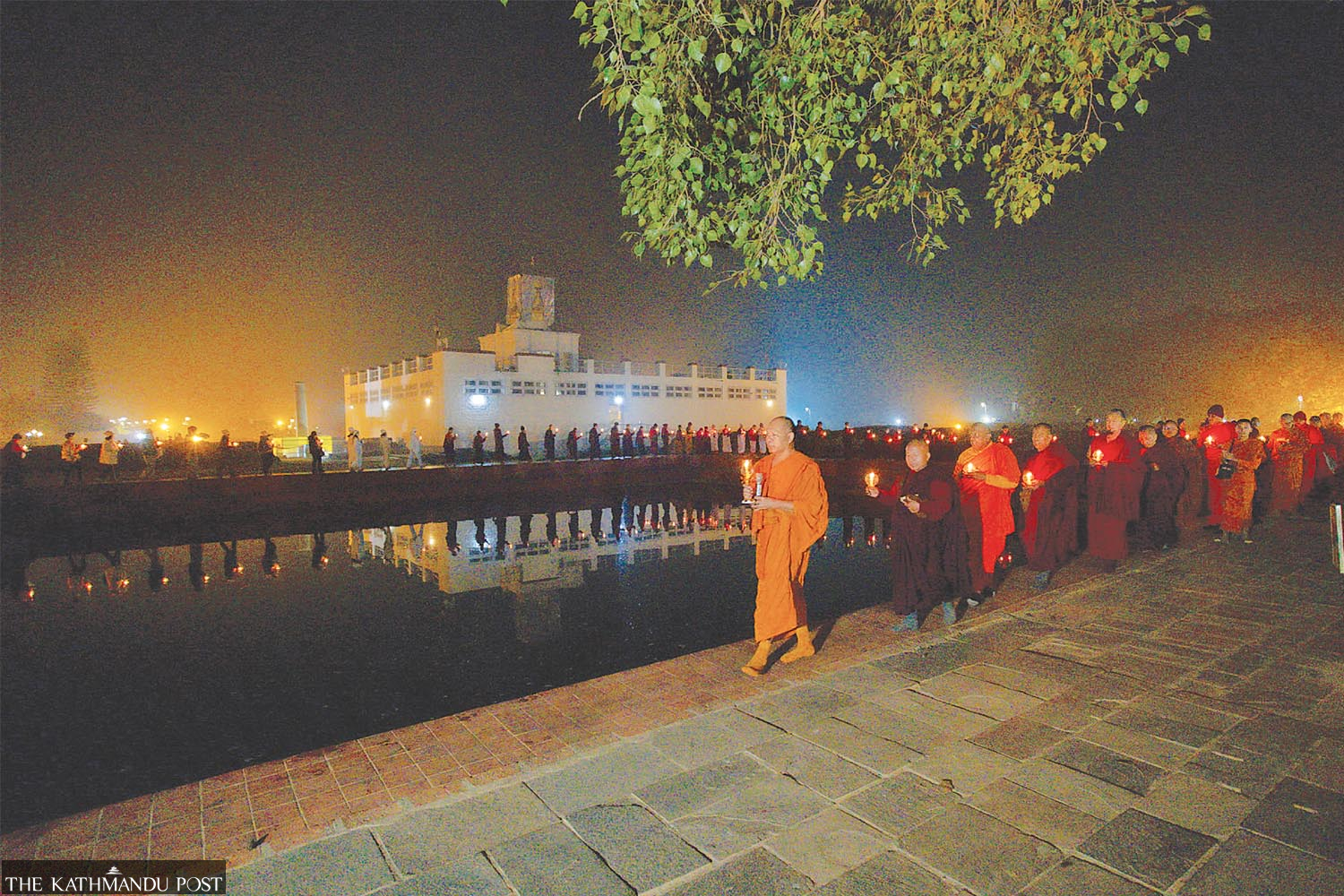 Monks and nuns circumambulate Pushkarini Pond, lamps in hands, wishing for world peace at Mayadevi Temple in Lumbini on Sunday, the first day of the year 2023. Manoj Paudel/TKP