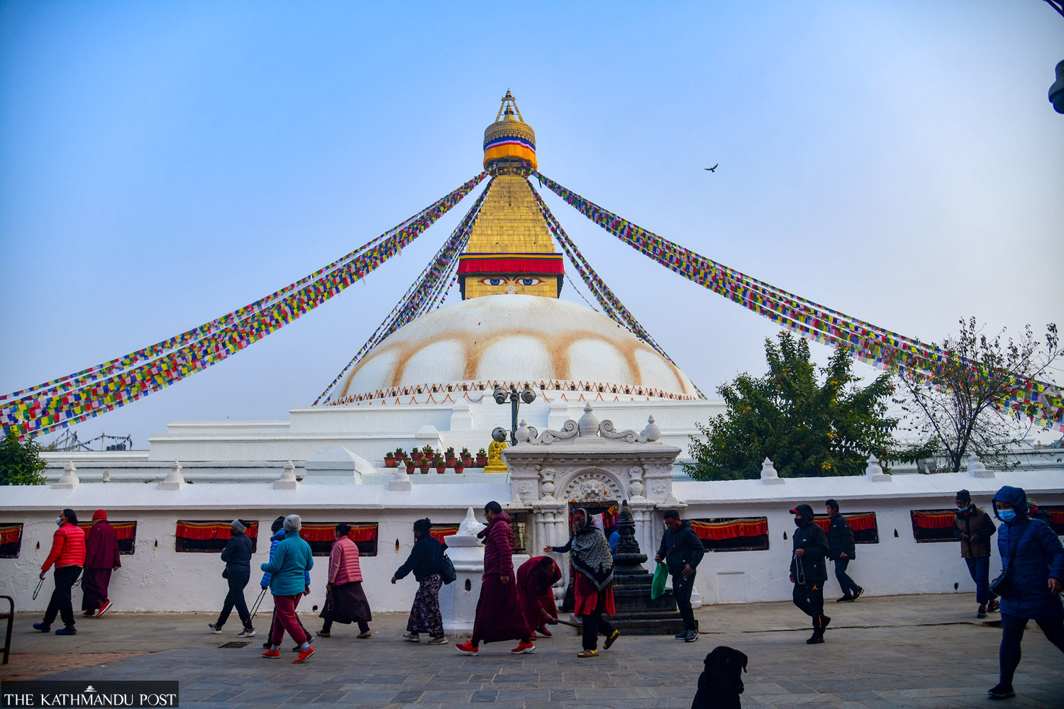 People take a stroll around the Bauddha Stupa in Kathmandu on Tuesday morning. Deepak KC/TKP
