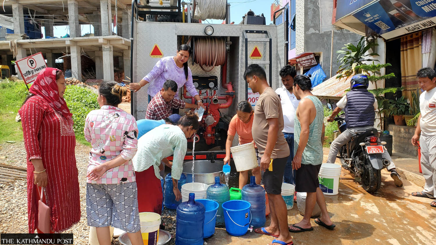 Local residents fill their vessels with water from a fire truck in Khandbari of Sankhuwasabha district on Sunday. After an acute water shortage caused by a prolonged dry spell, the municipality has begun distributing water sourced from a nearby river. Dipendra Shakya/TKP
