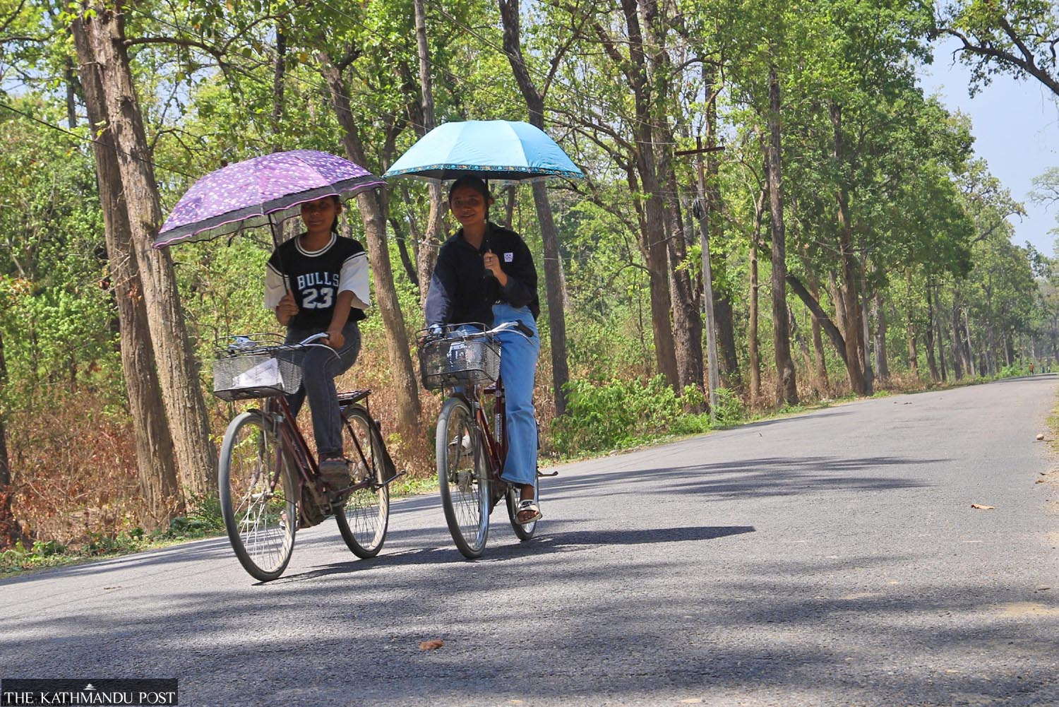 Two girls cycle along the Chitkaiya section of the Thakurdwara-Ambasa road in Bardiya district on Monday afternoon. Scorching temperatures have greatly impacted life across the southern plains of Nepal. Manoj Poudel/TKP