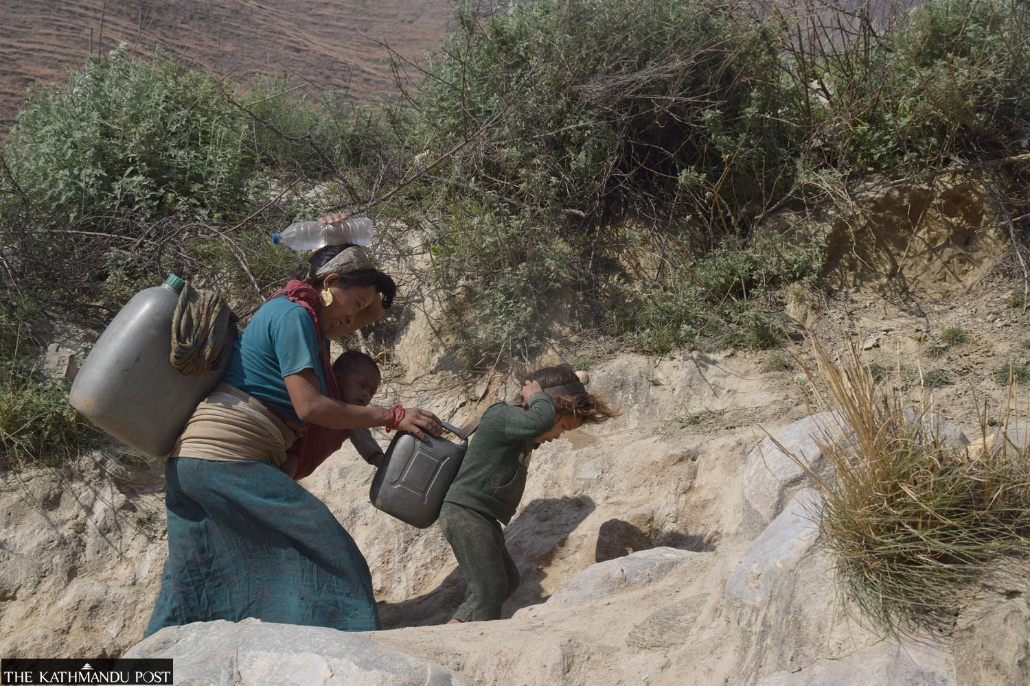 Alina Thapa, a resident of Thapagaun in Humla, heads home carrying a jar of water with her children from a source near Galwagad in Humla recently. Basanta Pratap Singh/TKP