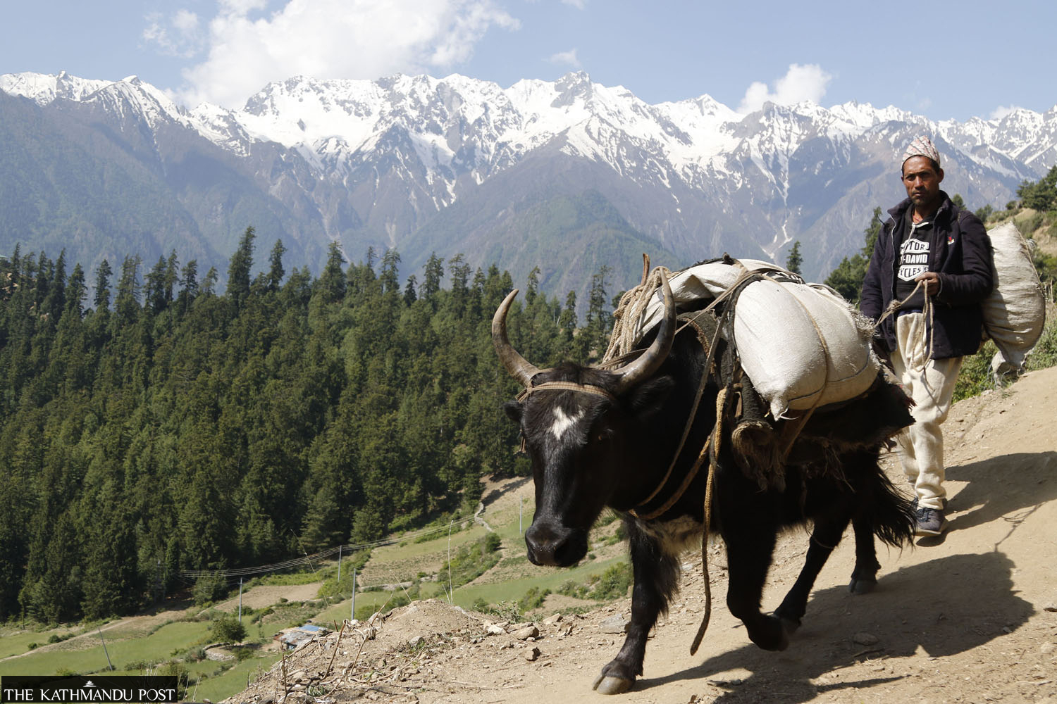 A man pictured last week driving a beast of burden towards Simkot, the district headquarters of Humla, in western Nepal. Keshav Thapa/TKP