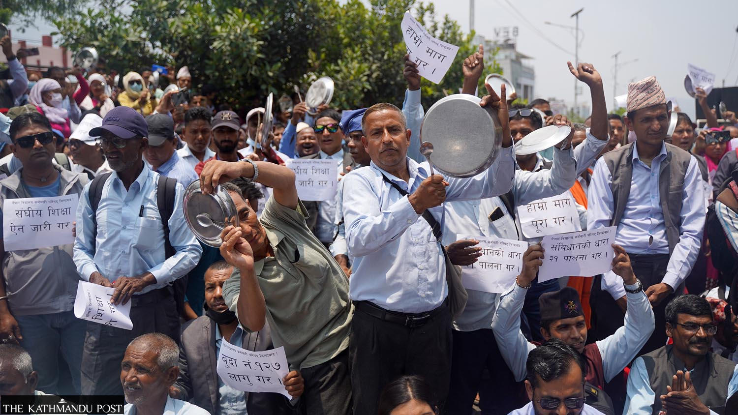 Administrative staff of community schools stage a protest demanding better pay and perks at Bhadrakali in Kathmandu on Sunday. Angad Dhakal/TKP
