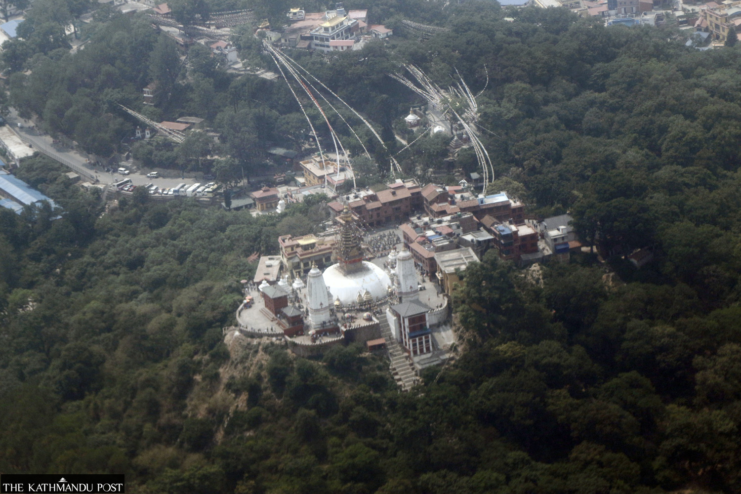 Swayambhu Stupa, a UNESCO World Heritage site, seen from a flight on Monday. Renovation of the Buddhist shrine in Kathmandu has begun. Keshav Thapa/TKP