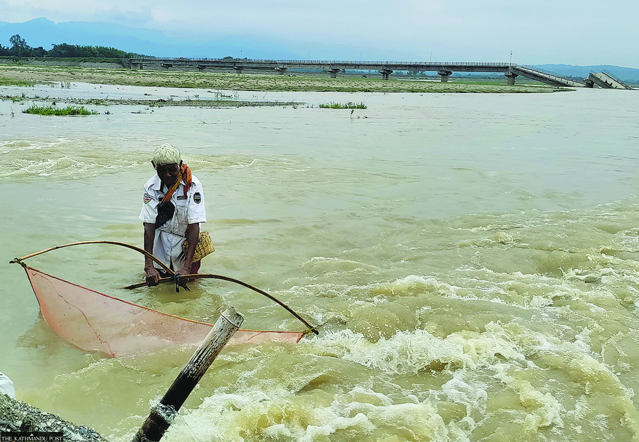 Ratan Chaudhary, 71, who was rendered homeless after the Triyuga river eroded his land at Chaudandigadhi-5 in Udayapur, catches fish as a means of livelihood. Dilliram Khatiwada/TKP
