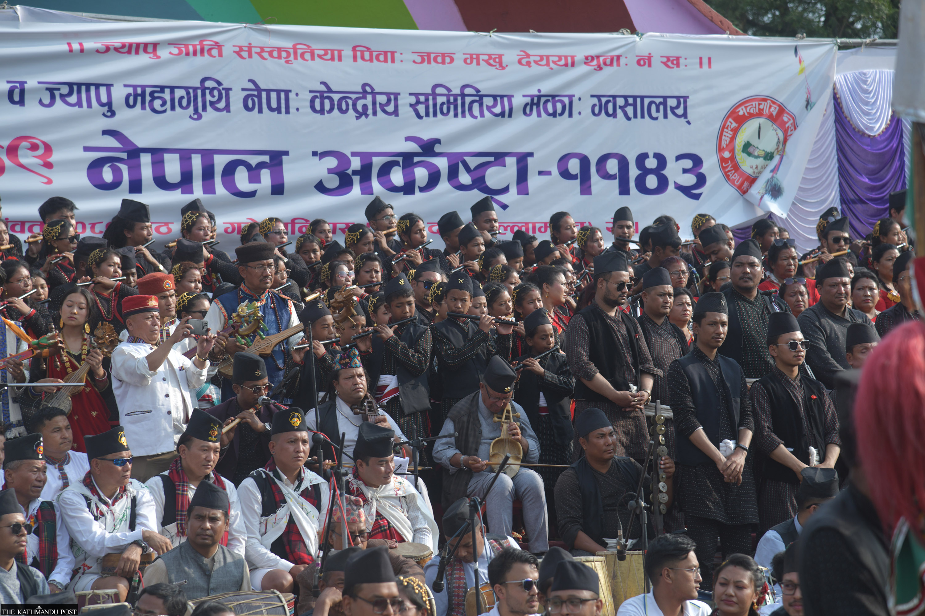 Participants of the Nepal Orchestra organised at Khula Manch in Kathmandu on Saturday. The event saw some 400 artists from various ethnic backgrounds. Deepak KC/TKP