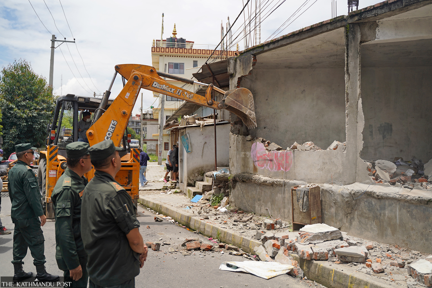 A municipal backhoe tears down the illegally-constructed building of Bhadra Kumari Ghale Sewa Sadan, a charity, in Anamnagar, Kathmandu on Wednesday. The Kathmandu Metropolitan City had given the building owners three days to vacate it, saying it was constructed in public land. Sanjog Manandhar/TKP