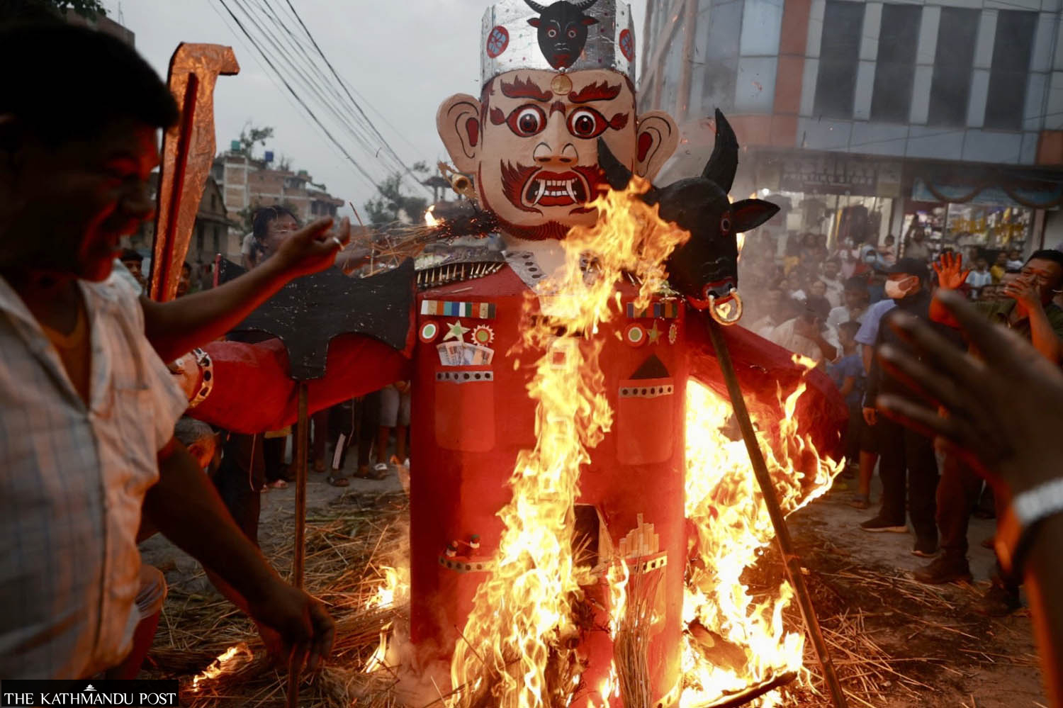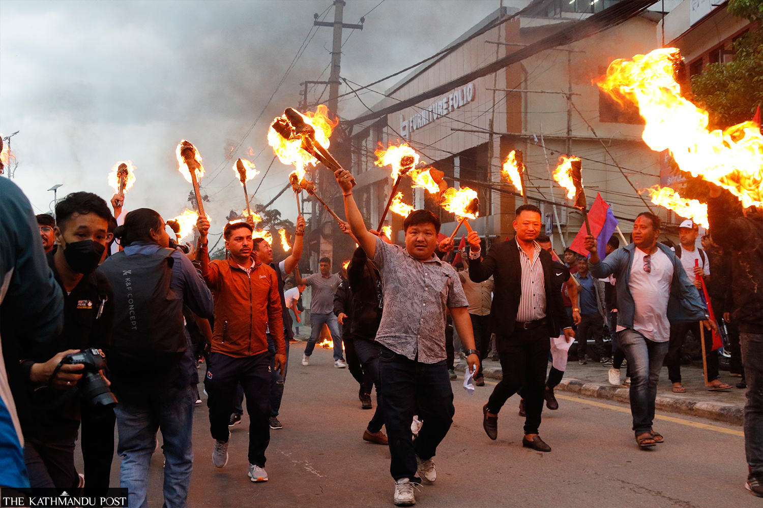 Activists of the CPN-UML’s youth wing National Youth Federation stage a torch march at New Baneshwar, Kathmandu on Friday calling for independent investigation into Tuesday’s gold seizure. They accused the authorities of catching the small fry while ignoring the kingpins. Post Photo