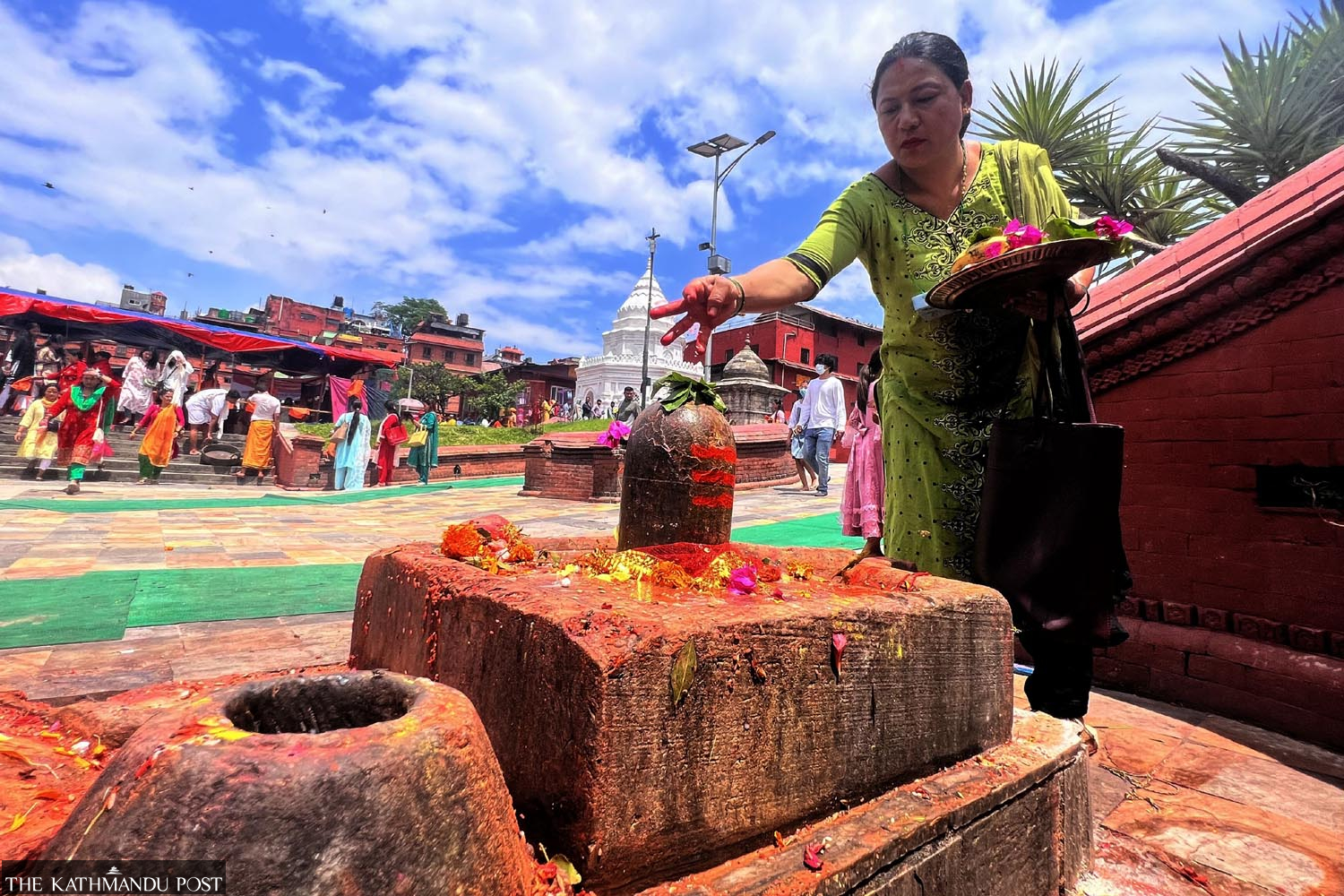 A devotee worships a Shiva Linga at the Pashupati area in Kathmandu, Monday. The Pashupatinath Temple and Shiva shrines across the country were packed with devotees on the day, as all Mondays of the Nepali month of Shrawan are considered especially auspicious for Shiva worship. Elite Joshi/TKP