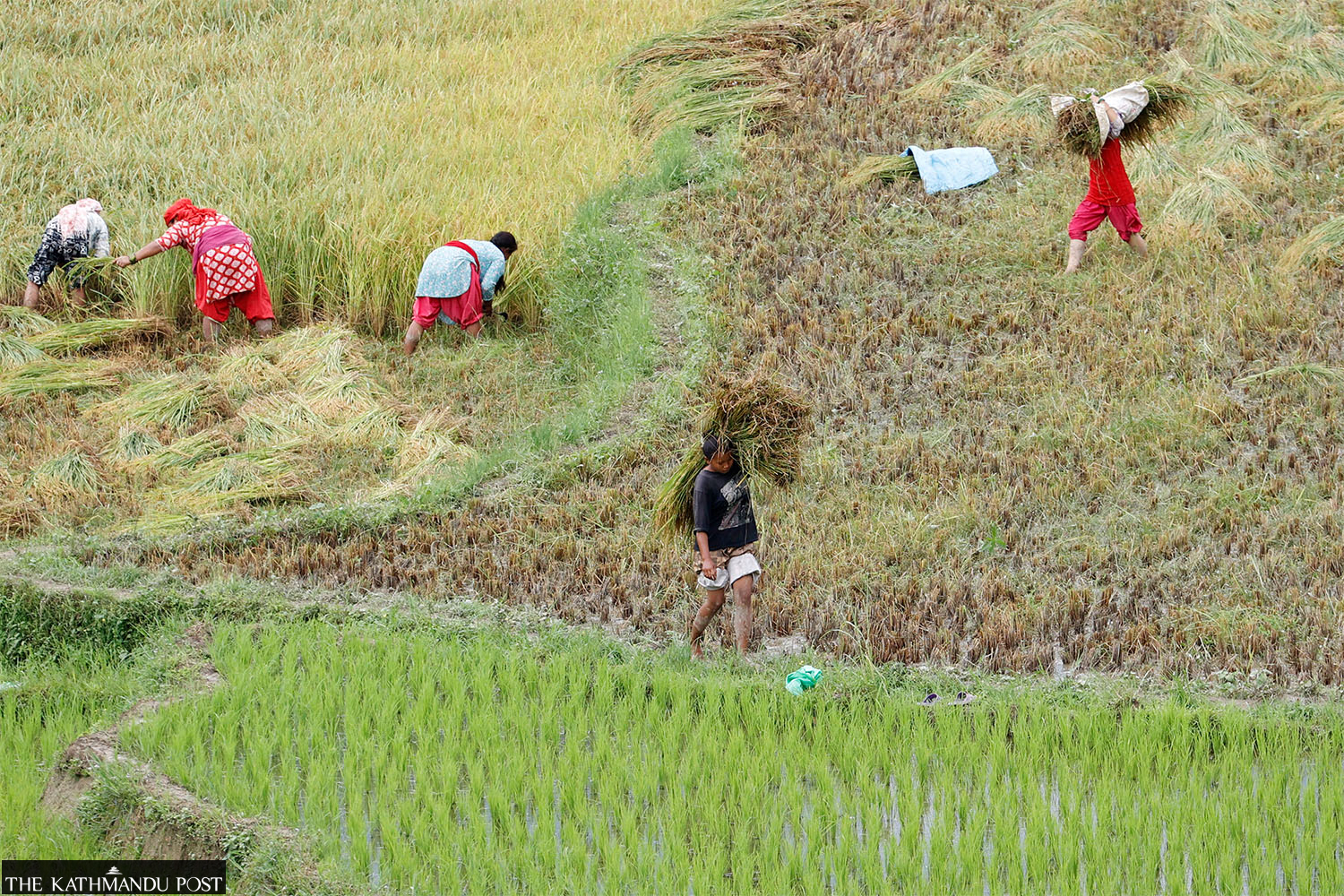 Farmers harvest paddy in Nuwakot, close to a field of new rice crop, on Tuesday. Sanjog Manandhar/TKP