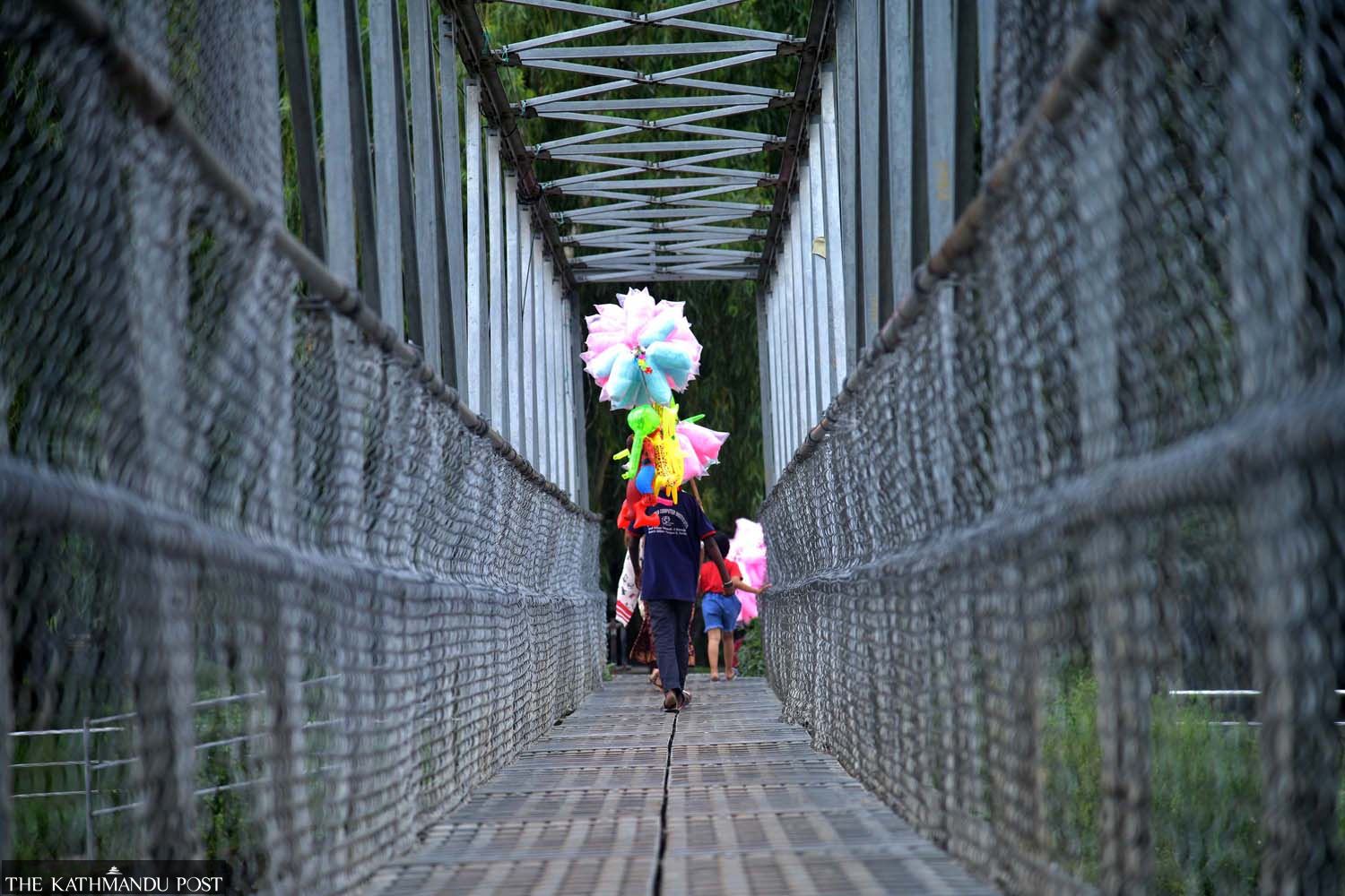 A boy selling cotton candy and inflated balloons on a long pole pictured crossing the footbridge across the Bagmati river at Shankhamul on Tuesday. Deepak KC/TKP