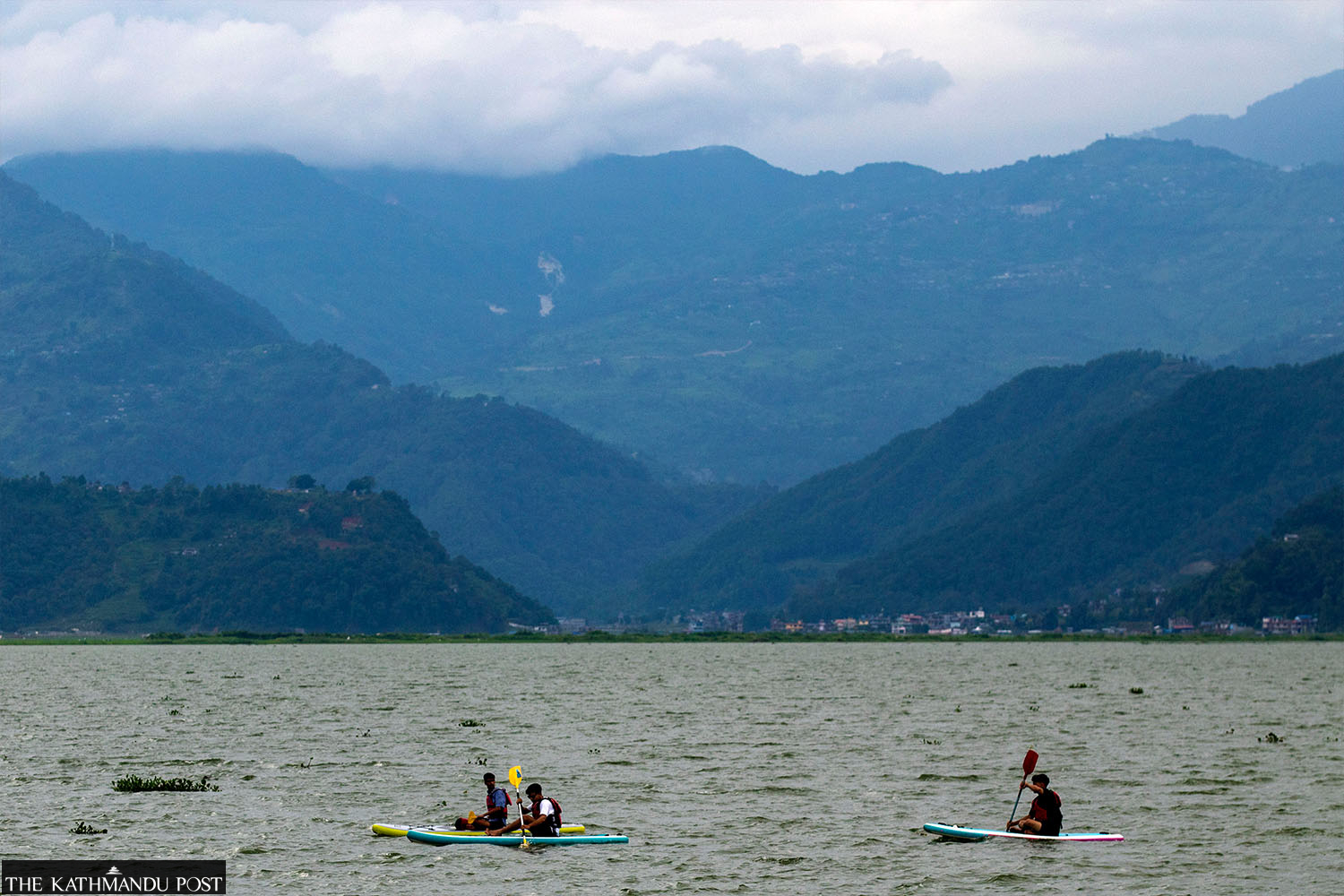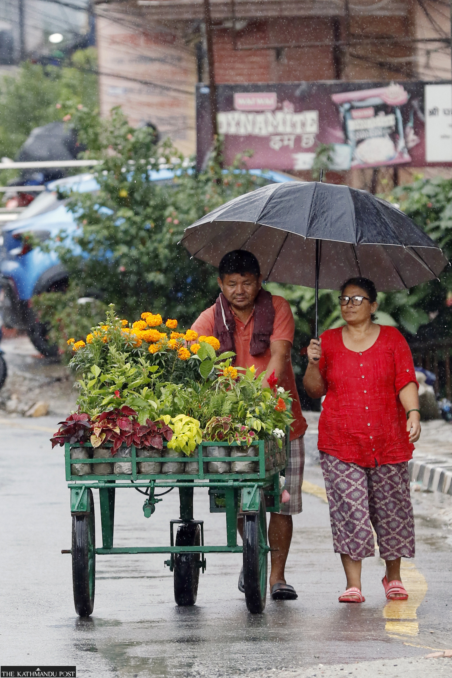 A couple ventures out to sell flower plants on a cart as it rains at Fasku in Nagarjun Municipality on Saturday. Keshav Thapa/TKP