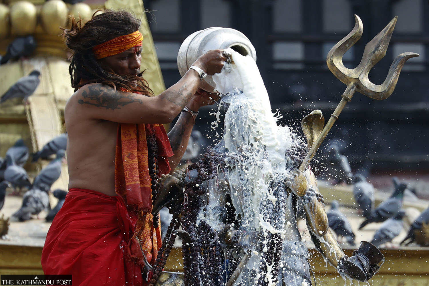 A sadhu pours panchamrit, a mixture of milk, curd, honey, jaggery and ghee, on the idol of Lord Shiva at Makhan in Kathmandu on Monday. Sanjog Manandhar/TKP