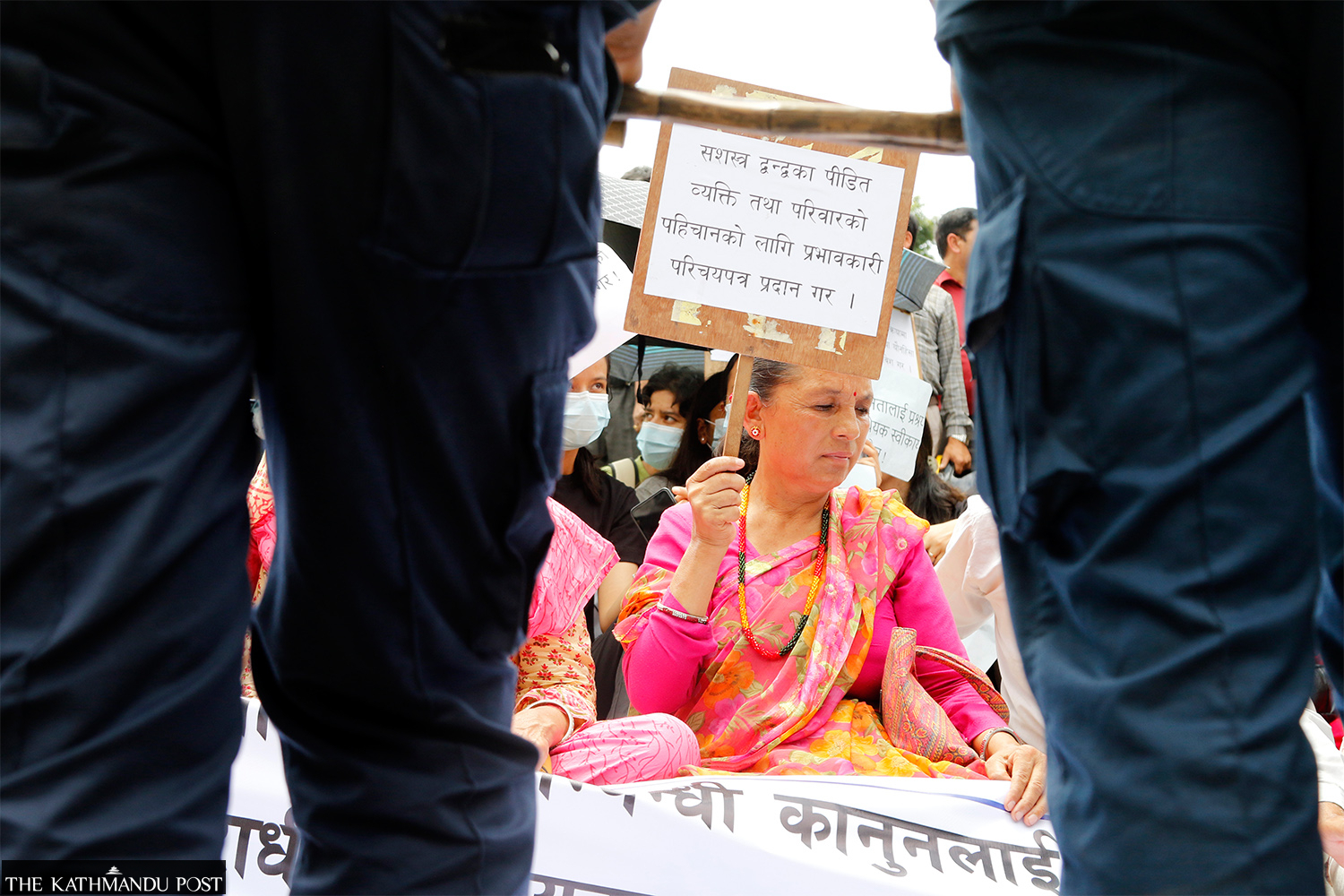 Victims of the Maoist insurgency stage a sit-in in outside the Kathmandu District Court at Babar Mahal on Friday. They were protesting perceived attempts by the government to amend the transitional justice law to benefit the perpetrators of human rights violations. Post Photo