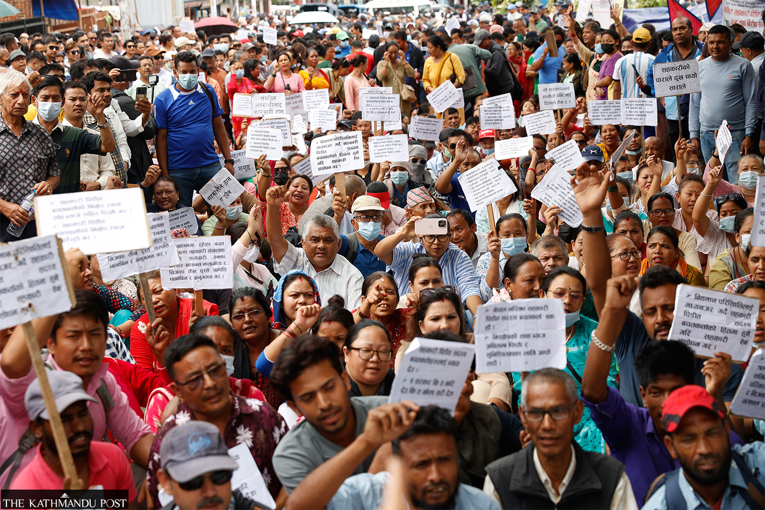 Victims of cooperatives march from Maitighar to New Baneshwar in Kathmandu on Thursday demanding the security of their savings. Later in the day, they reached a seven-point agreement with the government that includes setting up a fund to guarantee the deposits. Sanjog Manandhar/TKP
