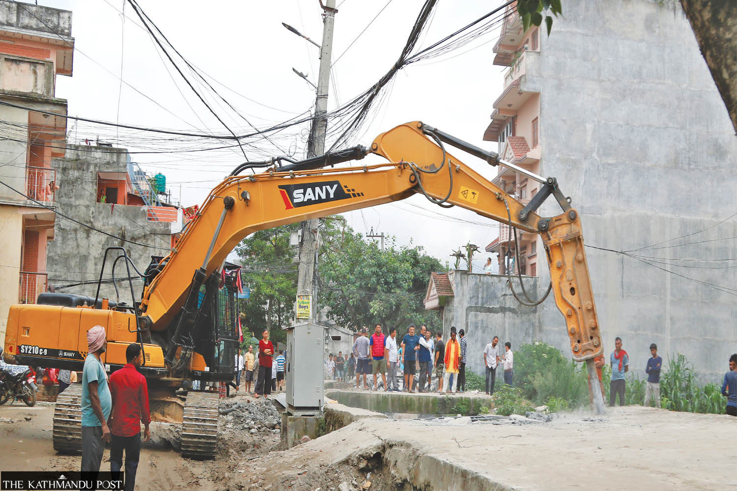 Municipal officials use a hydraulic hammer to tear down the unlawfully built concrete slabs over the Samakhushi brook at Ranibari in Kathmandu on Monday. Keshav Thapa/TKP