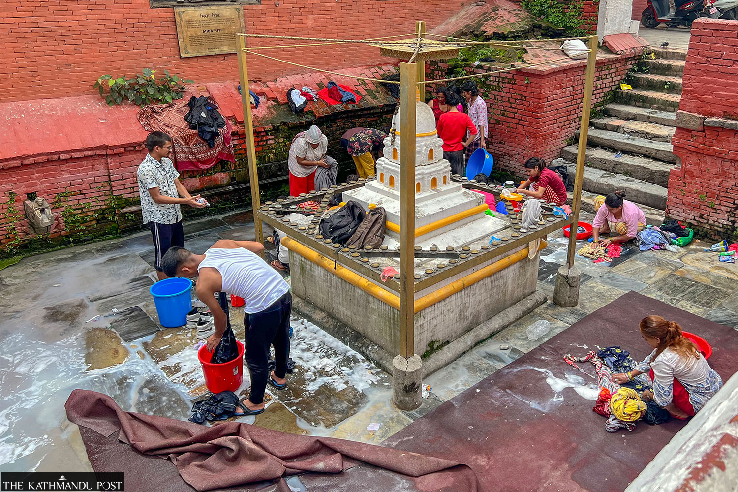 People wash their laundry at the Misa Hiti stone spouts at Bagalamukhi in Lalitpur on Wednesday. Elite Joshi/TKP