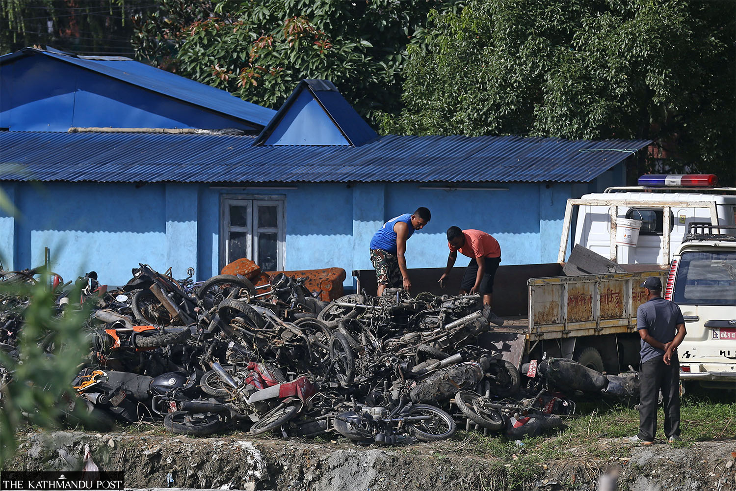 Personnel at the Balkumari Police Post in Koteshwar, Kathmandu manage motorcycles seized for various traffic offences over the past few years. Hemanta Shrestha/TKP