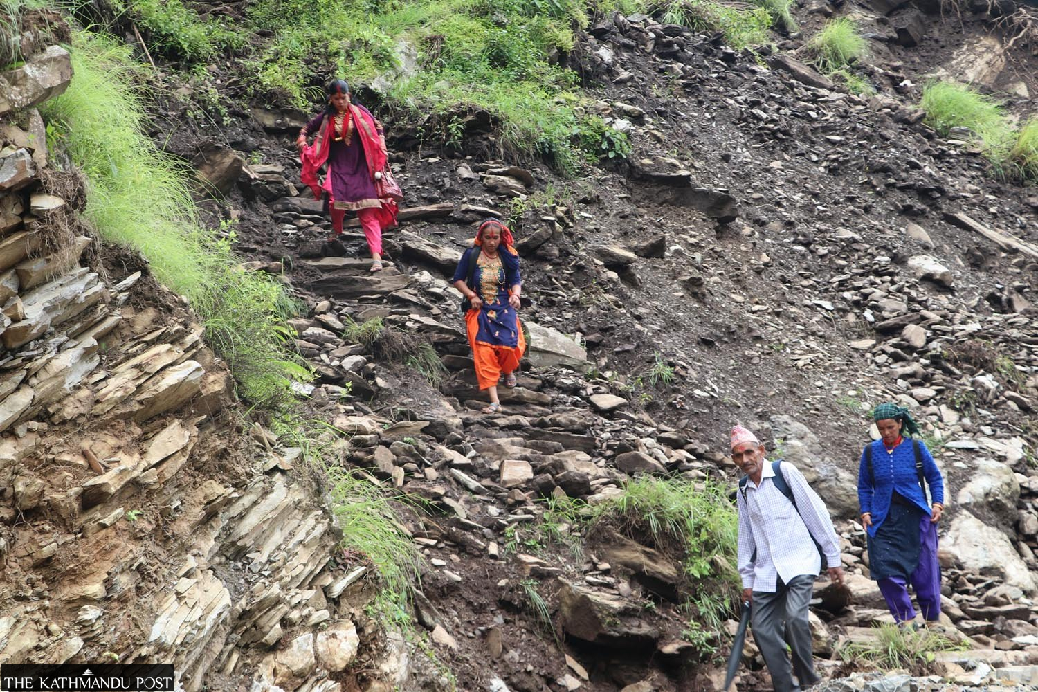 People descend a path cut off by a landslide at Timurpata near the Khalanga-Tinker road that connects Darchula district headquarters with Byas Municipality. The way disrupted 10 days ago has yet to be repaired, forcing residents to make precarious journeys. Manoj Badu/TKP