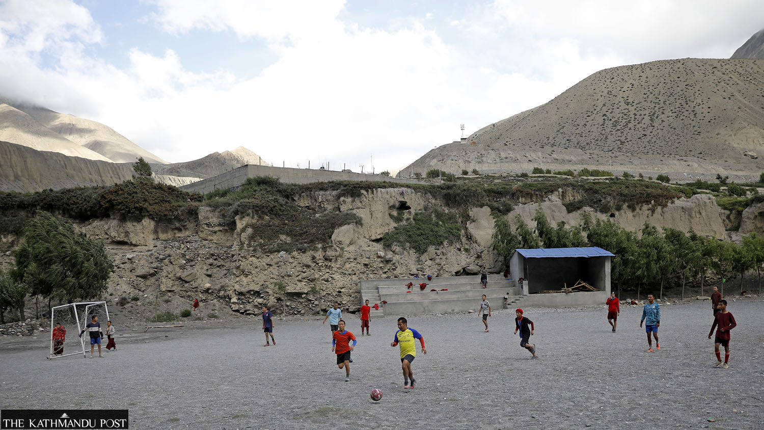 Youths enjoying a football game in the evening at Kagbeni in the mountain district of Mustang last month. The district’s distinctive barren hills are seen in the background. Angad Dhakal/TKP