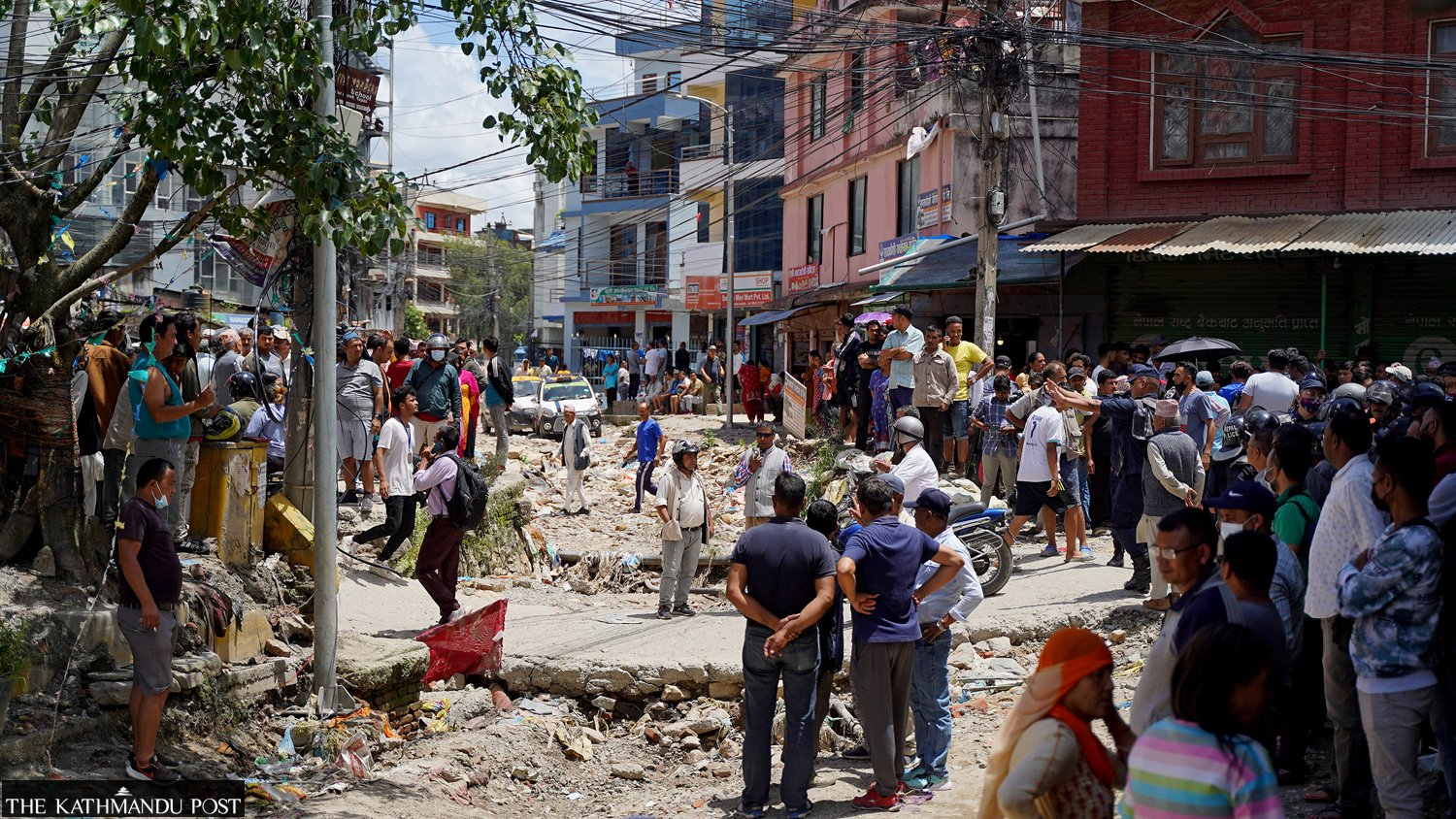 Local residents rise in protest as the Kathmandu metropolis staff moves to unilaterally remove illegal structures built by encroaching on the brook that forms the border between Kathmandu-7 and Budhanilkantha-10 wards in the Capital on Thursday. Angad Dhakal/TKP