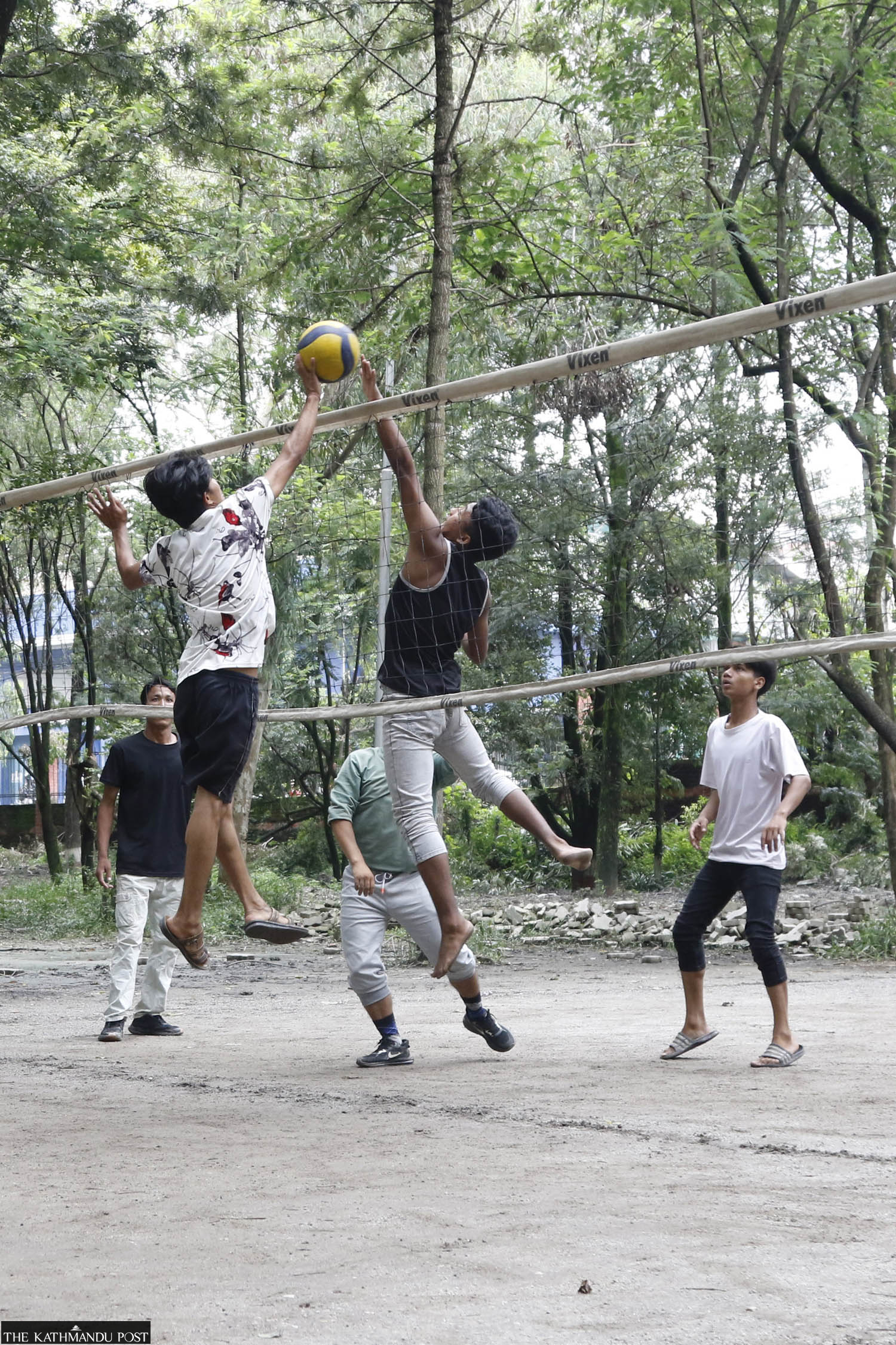 Youths leap for the ball during a game of volleyball at the UN Park in Jwagal, Lalitpur on Sunday. Keshav Thapa/TKP