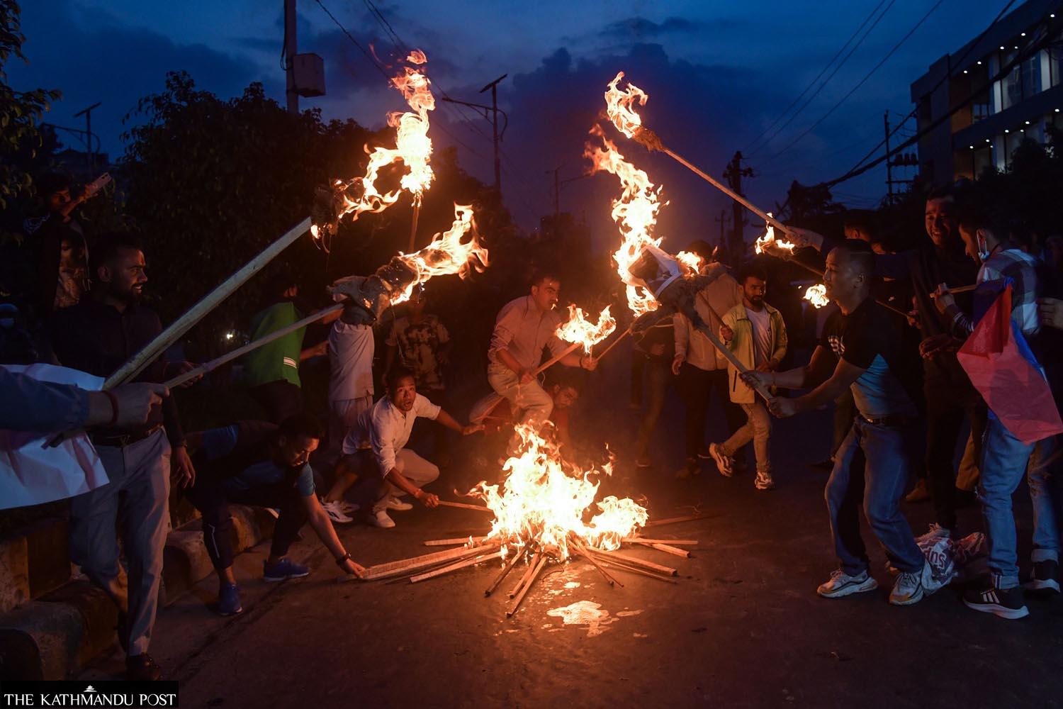 Members of the National Youth Federation, a sister wing of the CPN-UML, demonstrate against a price hike, in Kathmandu on Saturday evening. Deepak KC/TKP