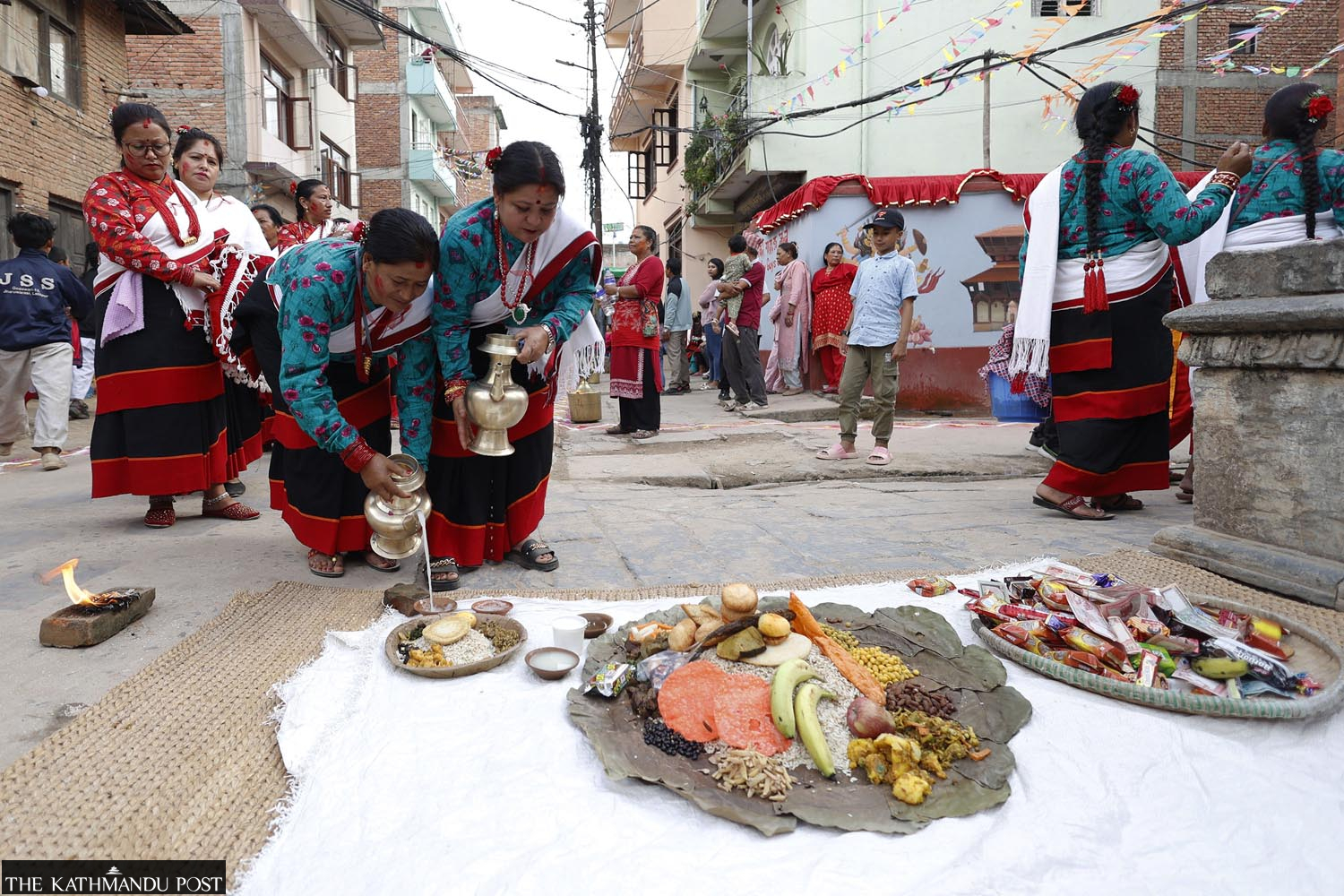 Women from the Newa community dressed in traditional attire perform Matya festival rituals at Thecho, Lalitpur on Friday. During the festival, people take part in a procession and pay tributes to the departed souls. Sanjog Manandhar/TKP