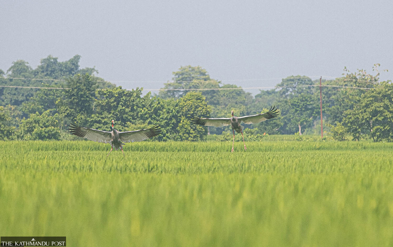A pair of grey cranes land gracefully on a paddy field at Harnaiya in Rupandehi district, in this recent photo. Manoj Paudel/TKP