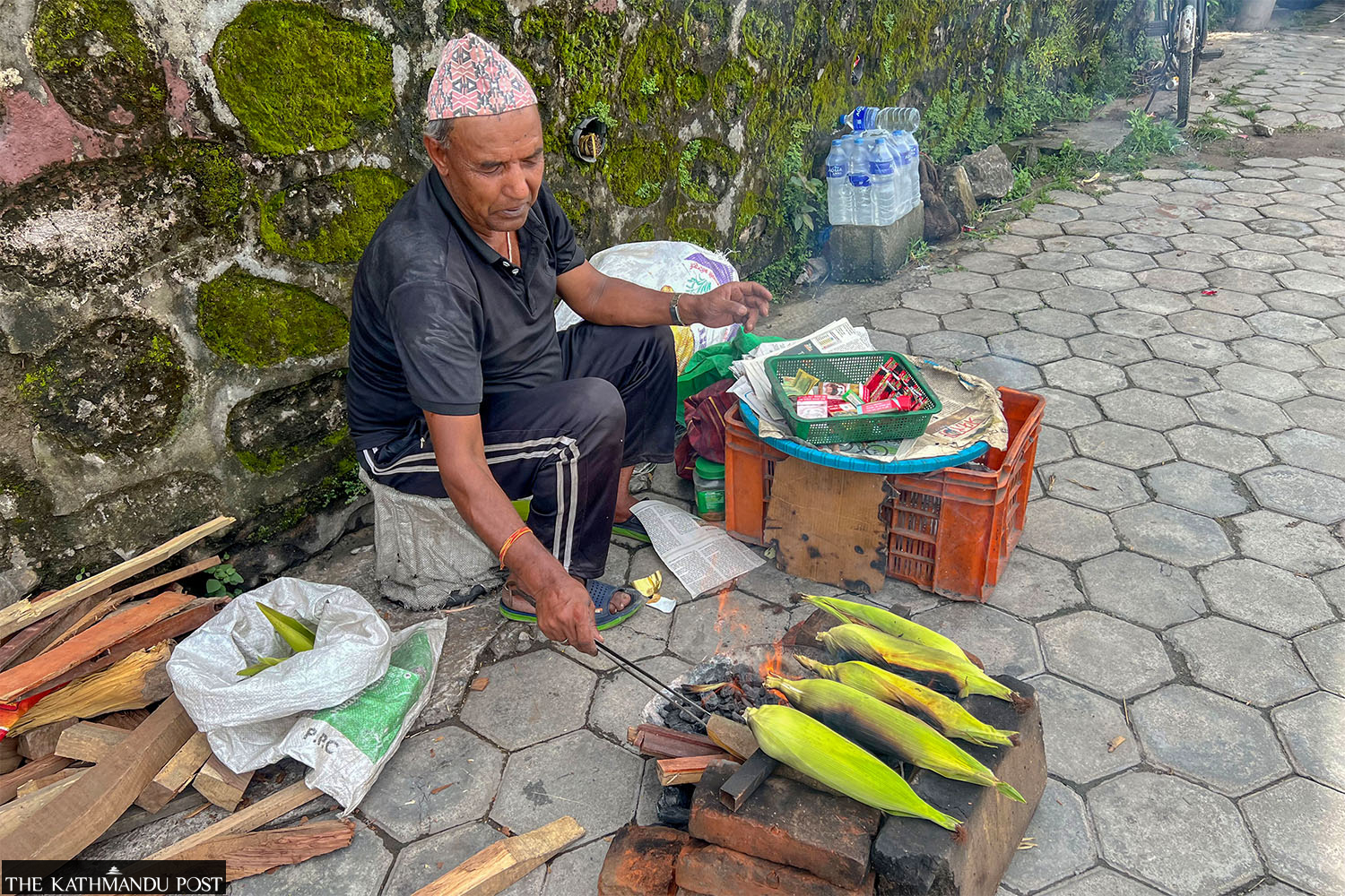 A man grills corn on the roadside at Maitighar in Kathmandu on Friday. Elite Joshi/TKP