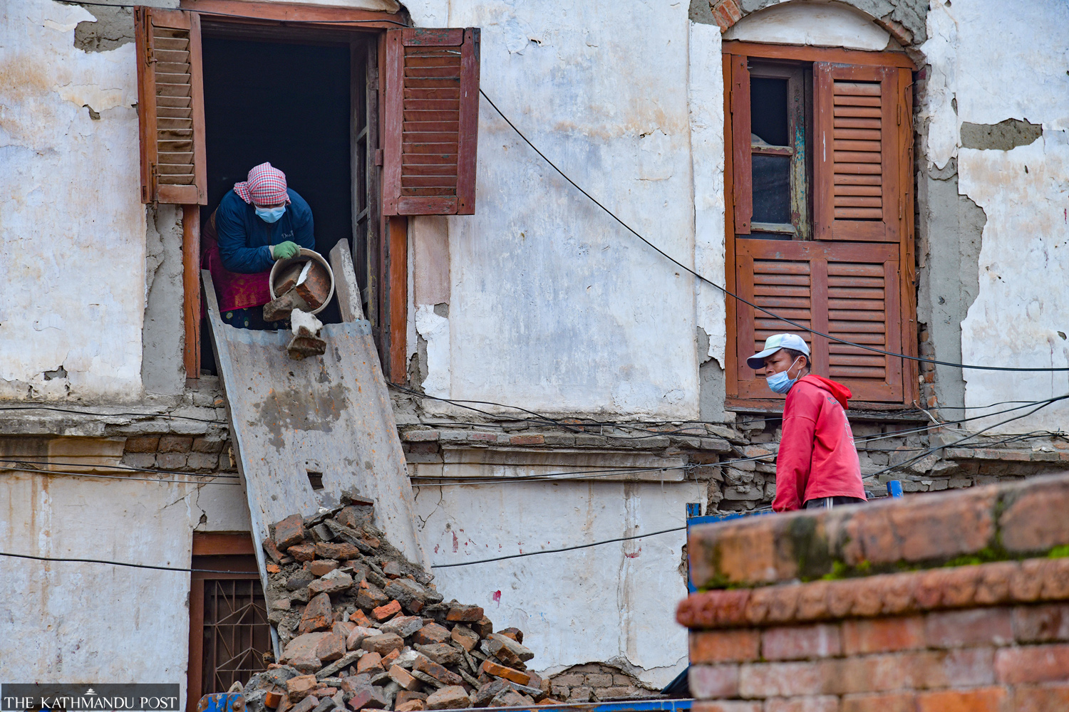Eight years after the devastating earthquake, restoration work is still continuing at Bhaktapur Durbar Square. Labourers pictured at a damaged building on Tuesday. Deepak KC/TKP