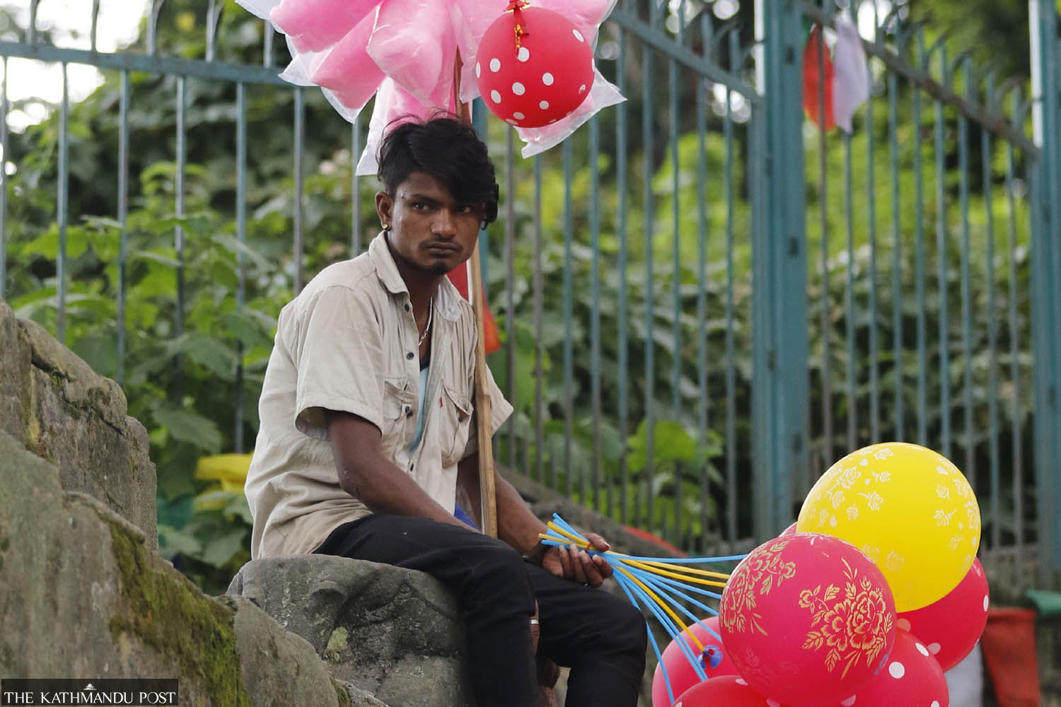 Dinesh Yadav, who hails from Rautahat, waits for customers to buy balloons and cotton candy at Swayambhu in the Capital on Sunday. He typically earns around Rs500 a day. Keshav Thapa/TKP