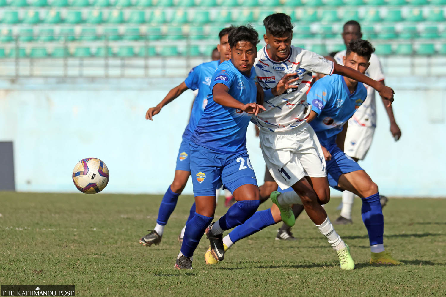 Players of Pokhara Thunders (blue) and FC Chitwan compete during the Nepal Super League at the Dasharath Stadium in Kathmandu on Saturday. Moses Gyabaah Twum’s 71st minute goal helped Pokhara defeat Chitwan. In the day’s other action, Lalitpur City beat Butwal Lumbini 2-0. Dinesh Henjan and Ananta Tamang were on target for Lalitpur. Post Photo