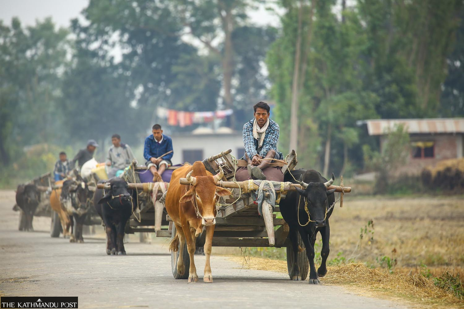 Farmers of Bhaura and Badalpur drive bullock carts laden with freshly harvested paddy for sale, to Rajapur 5 km away. Rice is the main source of income for the farmers of Bardiya, a food basket. Prakash Chandra Timilsena/TKP