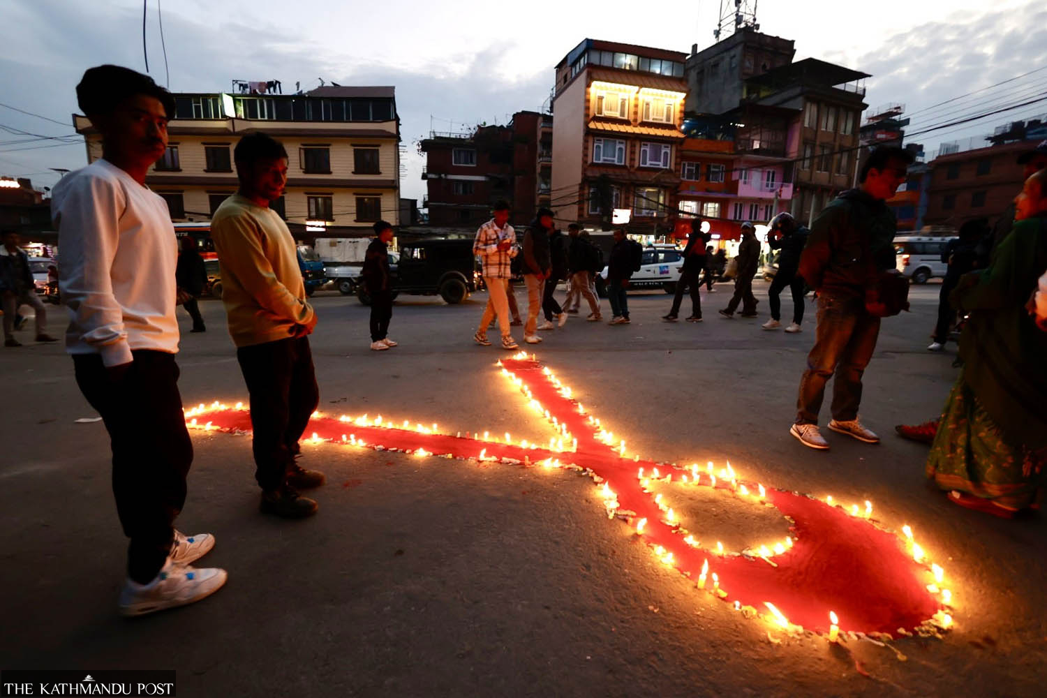 People light candles on the eve of World Aids Day in memory of those who died from the syndrome, at Gaushala in Kathmandu on Thursday. Sanjog Manandhar/TKP